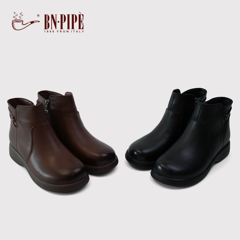 百年烟斗冬季加绒保暖妈妈短靴平底黑色中老年妈妈鞋复古真皮女鞋