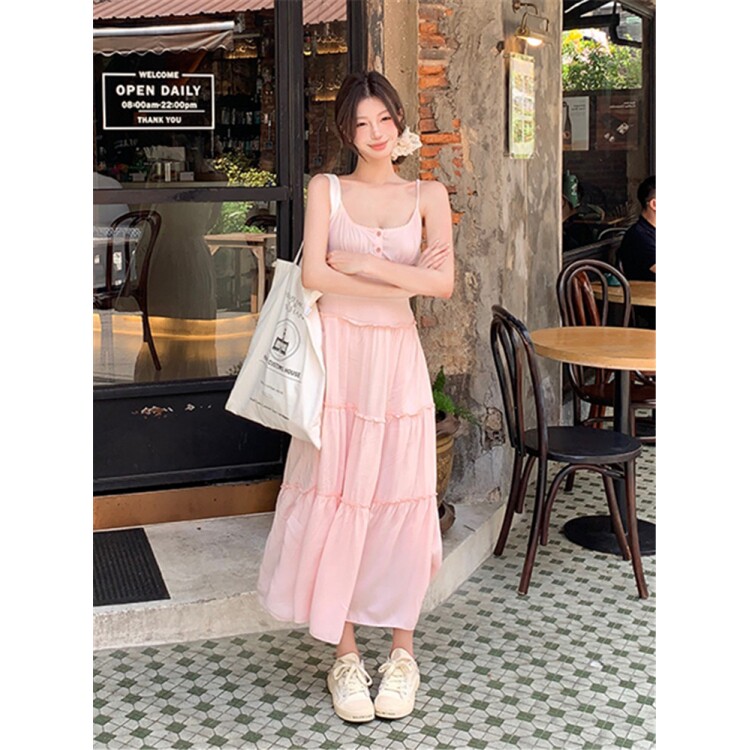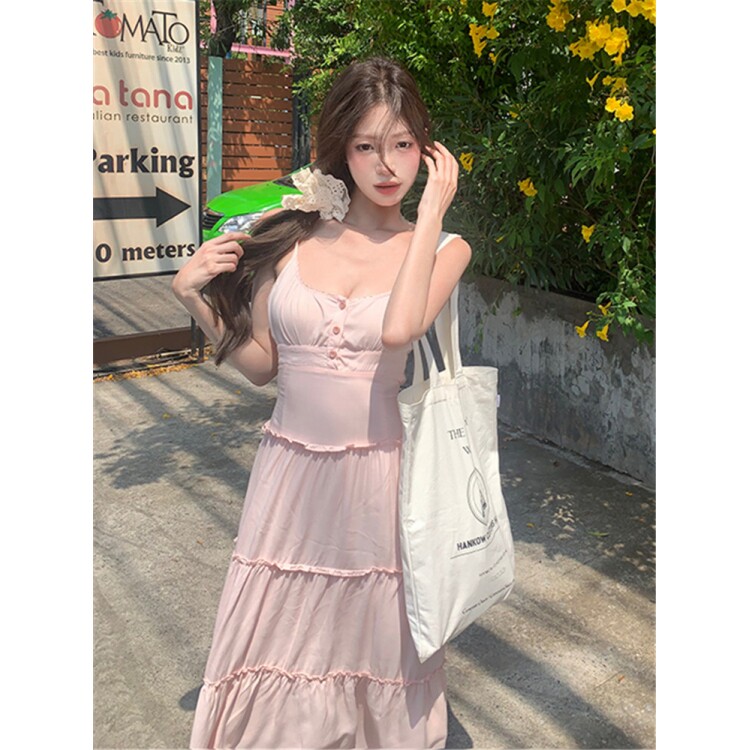 法式浪漫甜美吊带连衣裙夏季新款少女学生小个子收腰V领仙女裙子