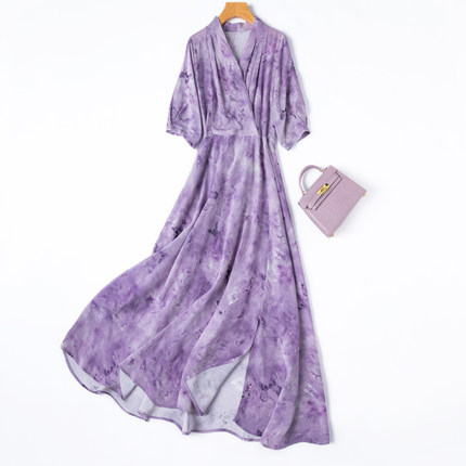 紫色梦幻加长款真丝连衣裙长裙