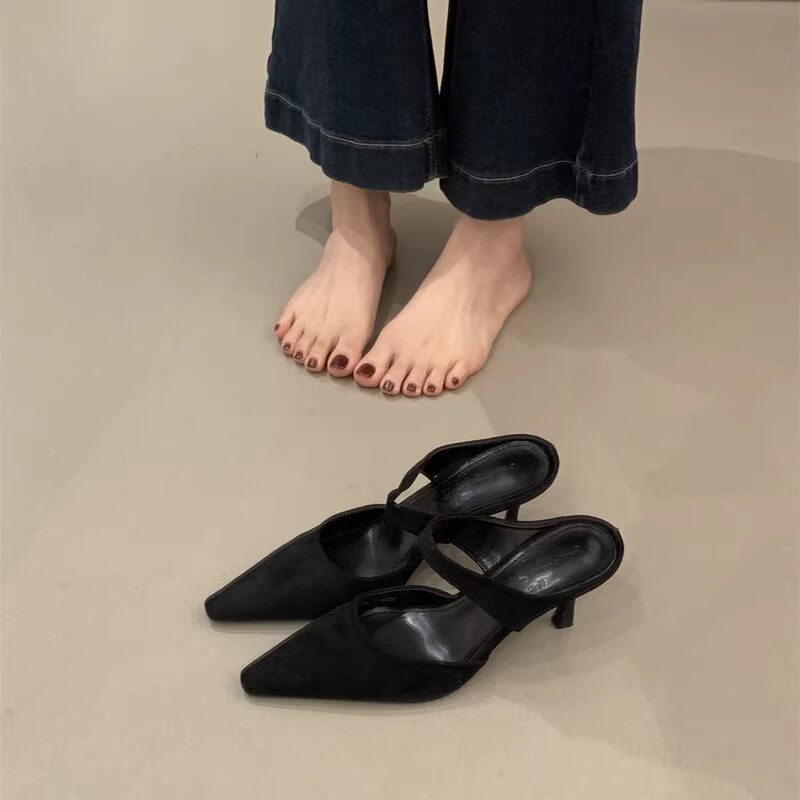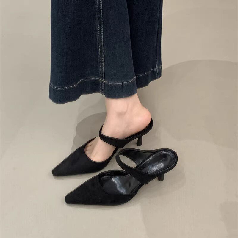 春夏2026新款穆勒鞋凉拖鞋女细跟尖头绒面高跟单鞋简约包头半拖鞋