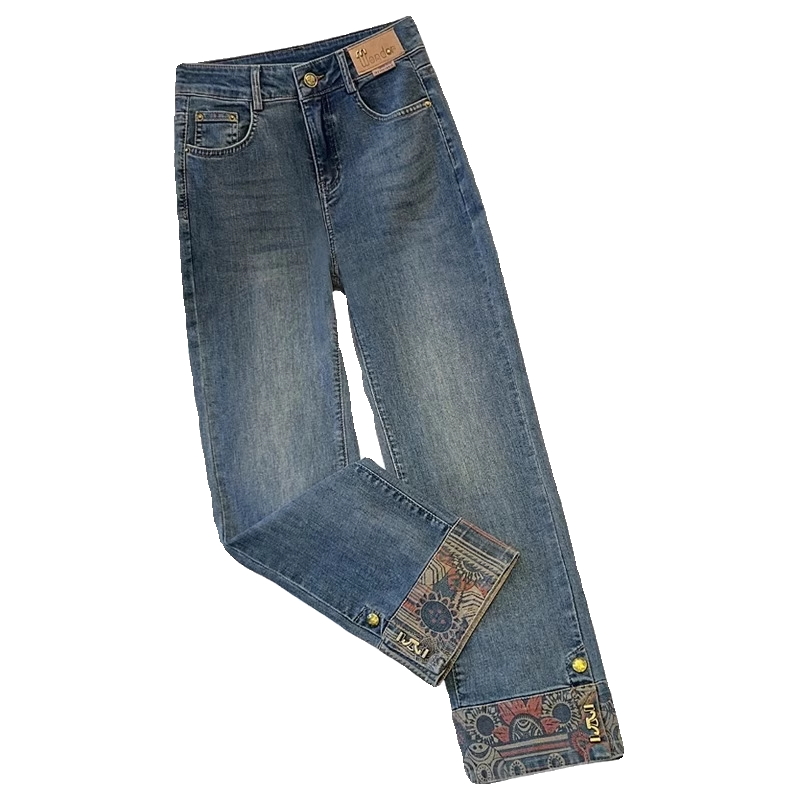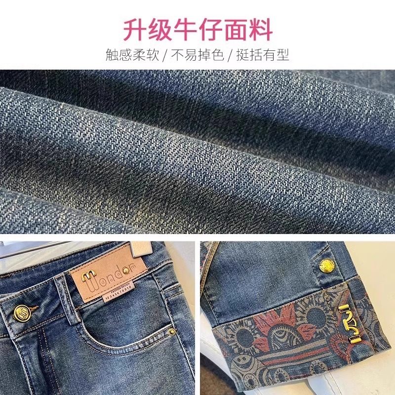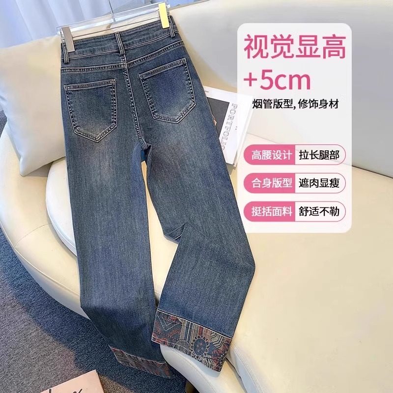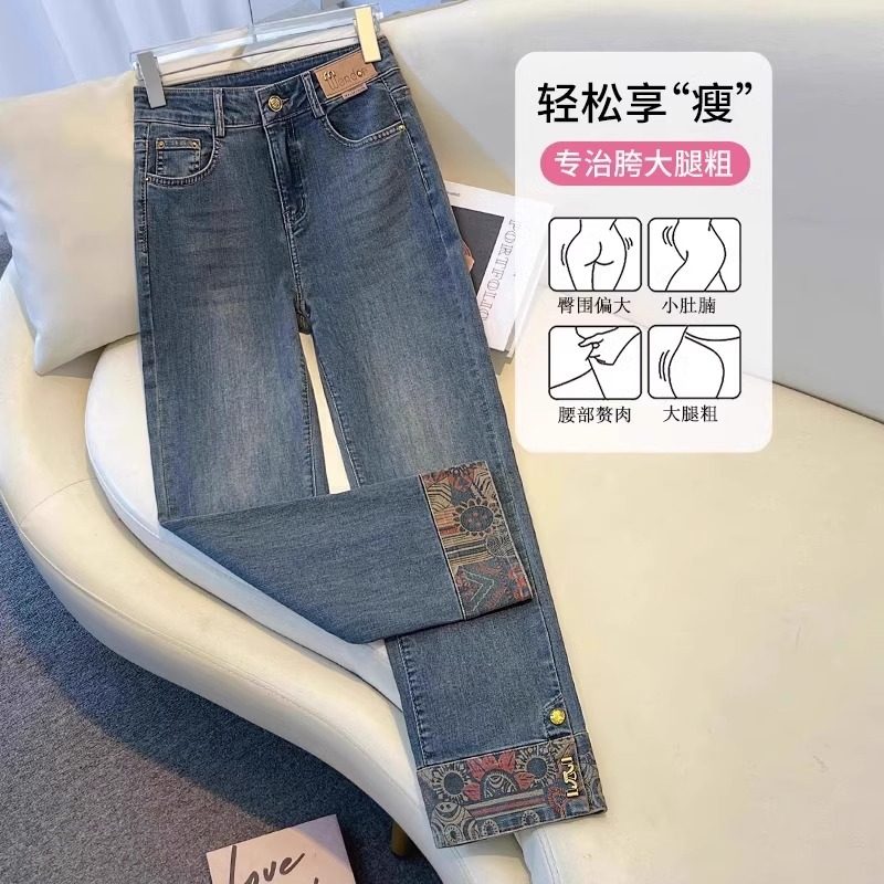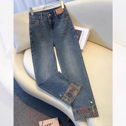 复古新中式直筒牛仔裤女春夏2025新款拼接九分裤子刺绣国风烟管裤
