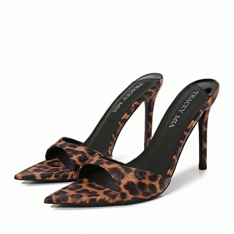 2025年新款夏豹纹半拖鞋性感尖头一字带高跟鞋女细跟凉拖鞋女外穿