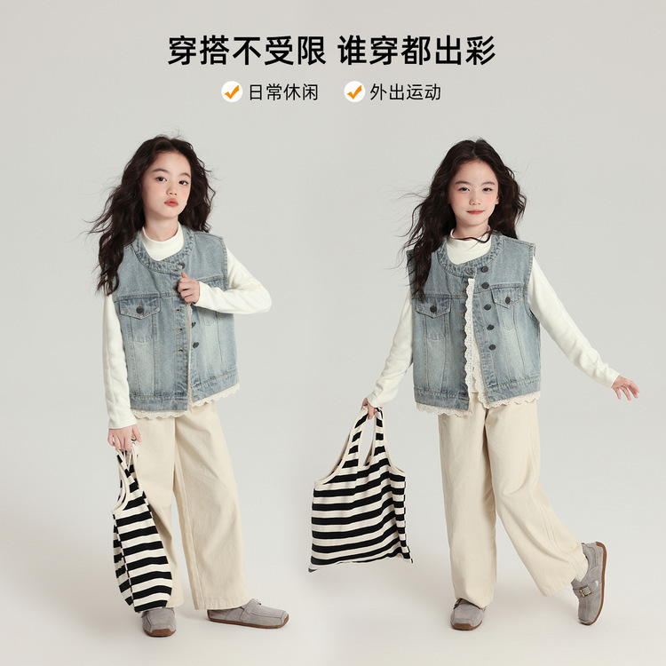 乔伊思童装童装马甲2025秋季新款蕾丝花边设计女宝牛仔背心甜美风