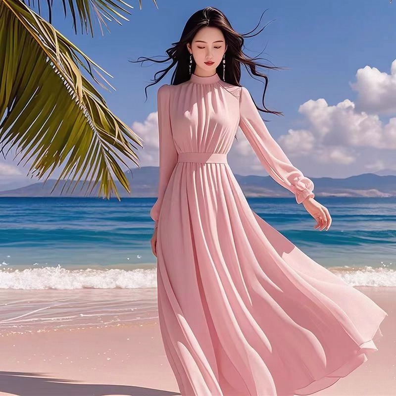 浅绿色连衣裙女夏2025新款长袖气质收腰海边度假长裙沙滩裙大摆裙