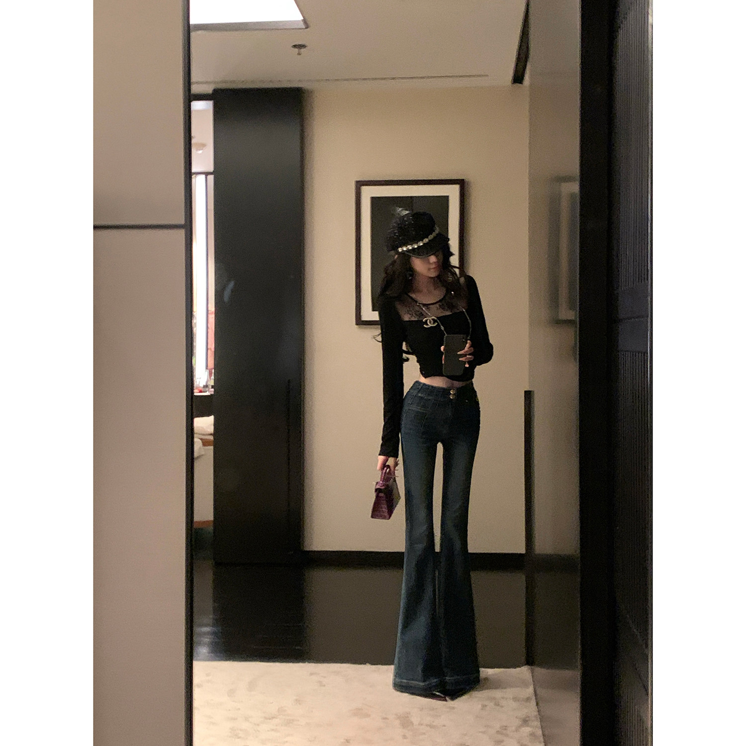 雅乔【视觉香水】秋装新款长袖露背后背系带蕾丝针织打底衫上衣女