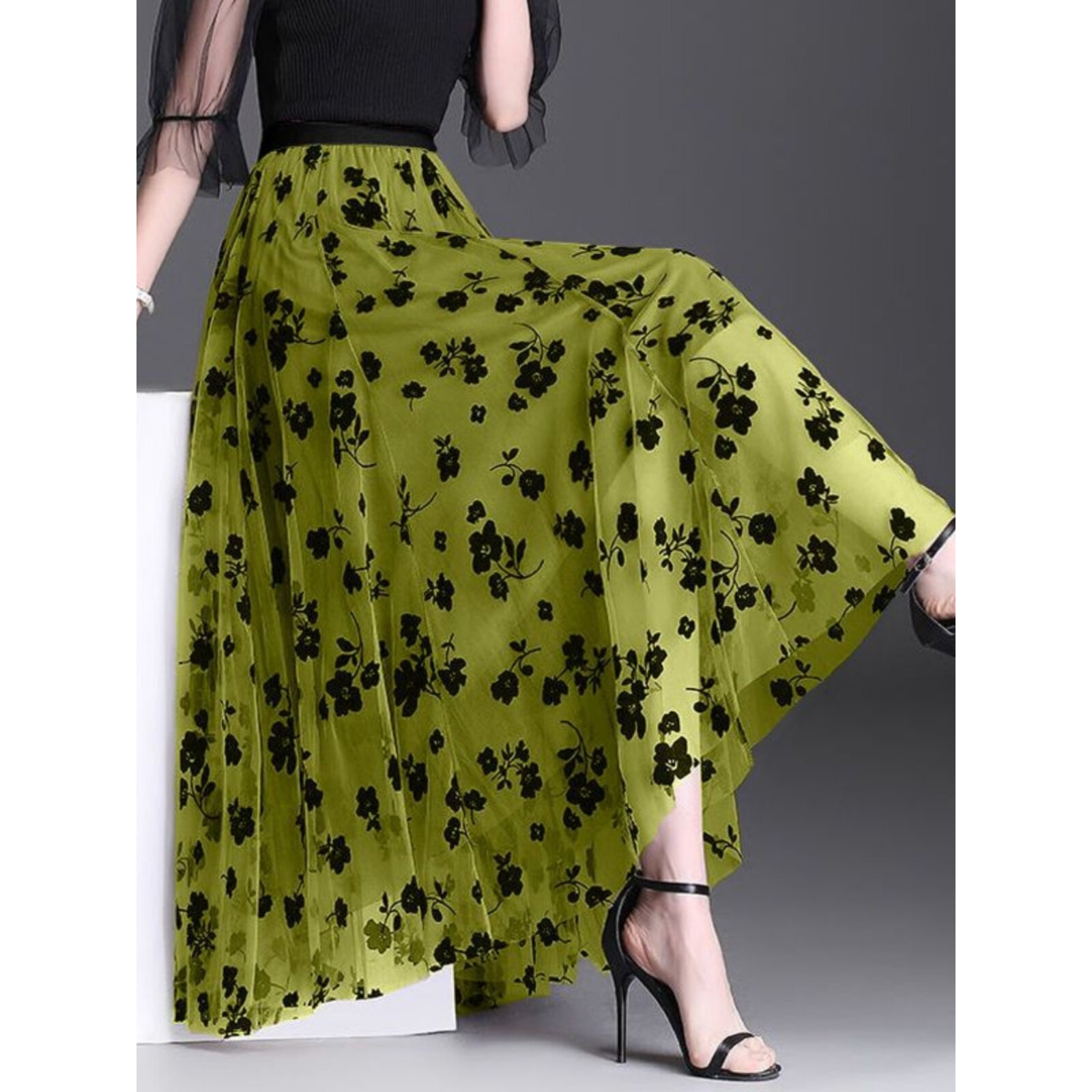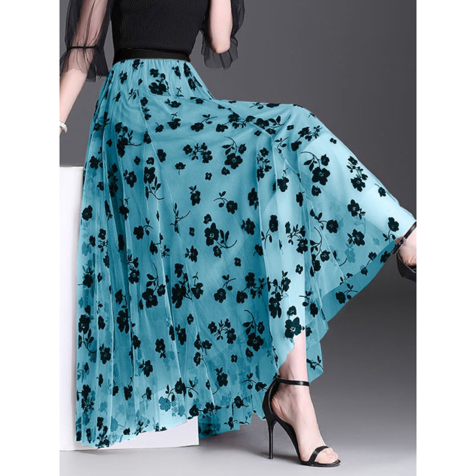 小碎花网纱大码半身裙2026春新款植绒中长款纱裙百搭高腰显半身裙