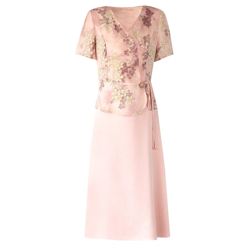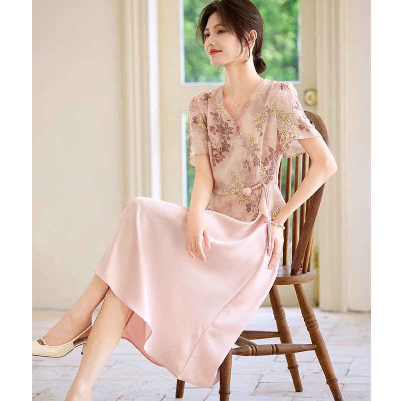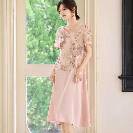 喜卉妈妈夏装洋气假两件短袖连衣裙中老年女装新中式国风百搭裙子