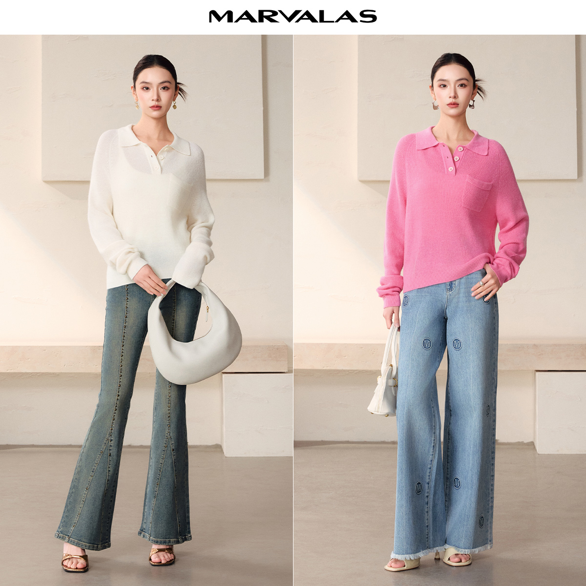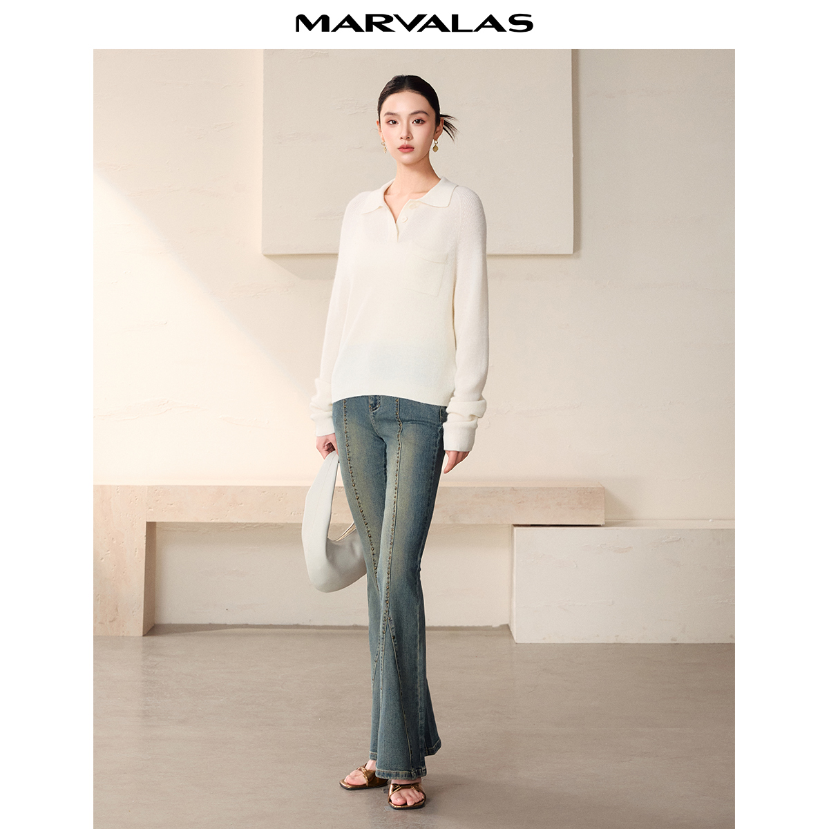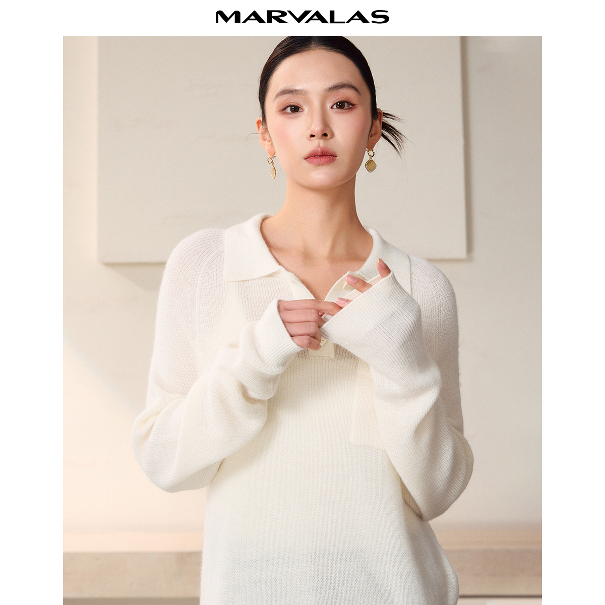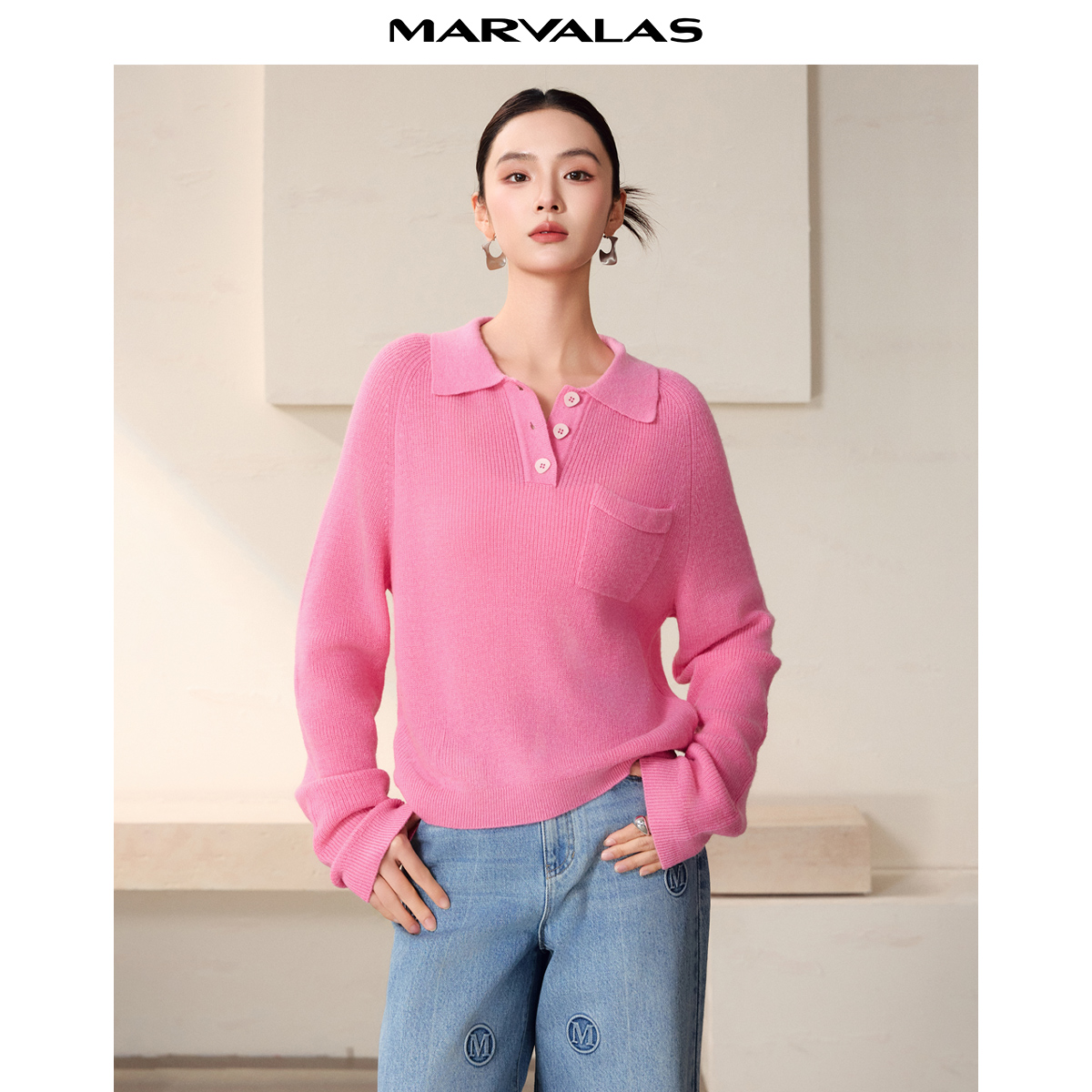 曼德诗绵羊毛混纺针织衫2025秋季新款时尚纯色Polo领短款套头衫女