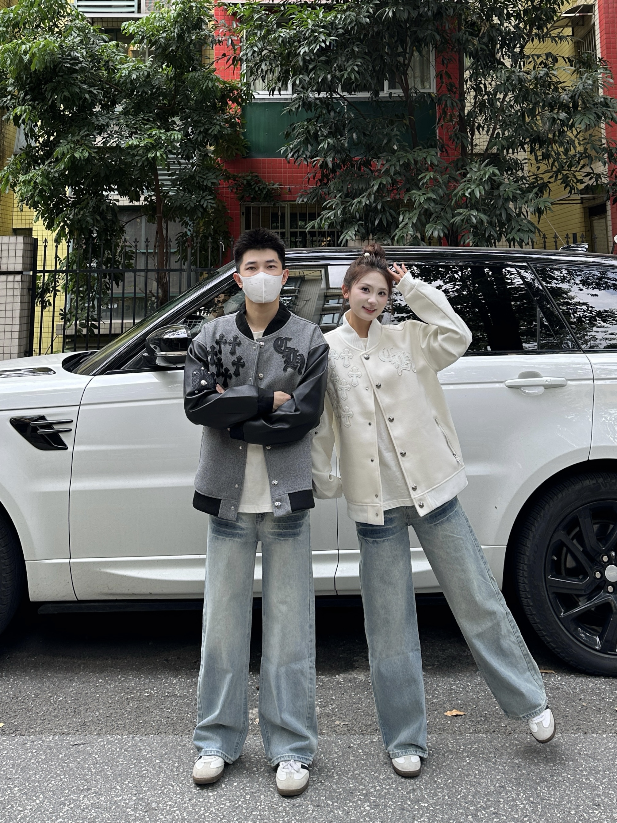3KU夫妇秋季新款刺绣十字架拼皮棒球服外套夹克男女情侣潮流上衣