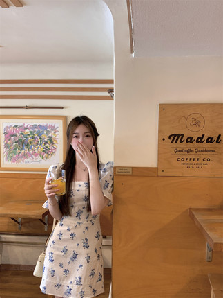 BOOMLIMIT 秀智同款 法式方领蕾丝蝴蝶结花边短袖亚麻连衣裙