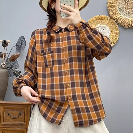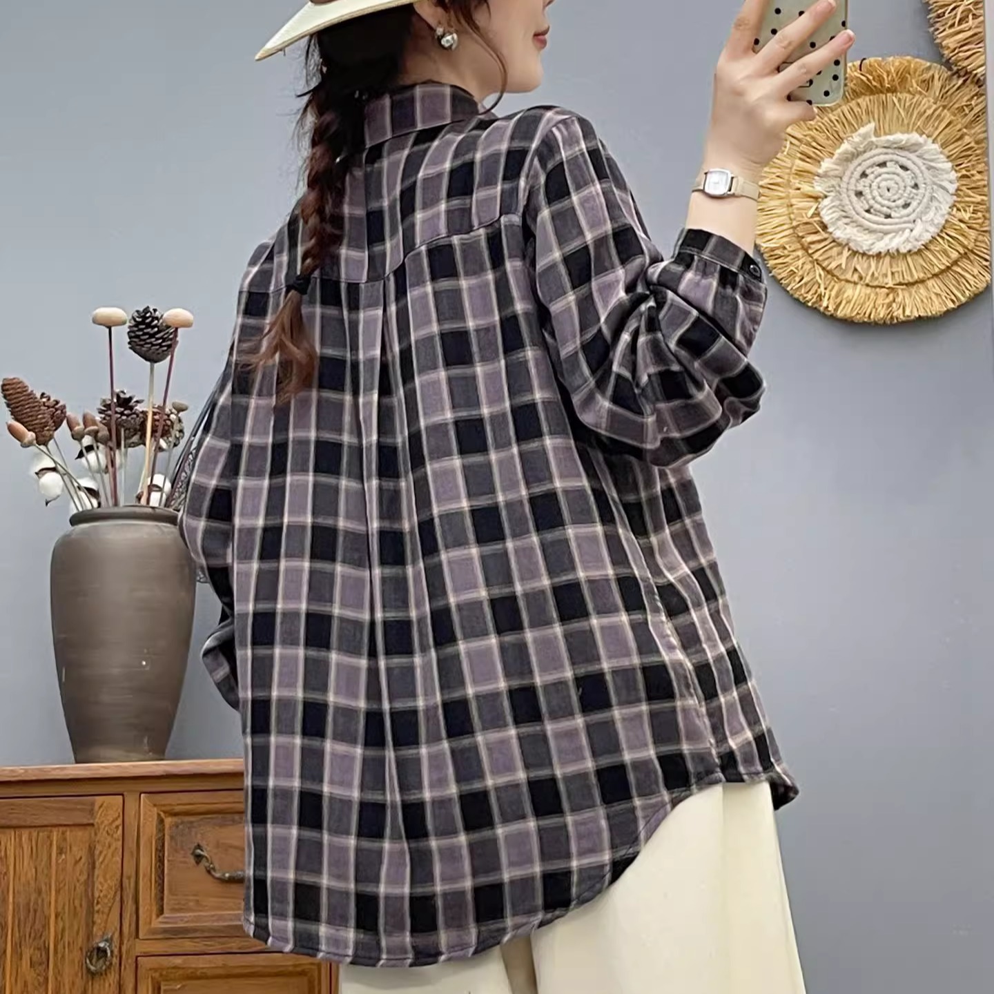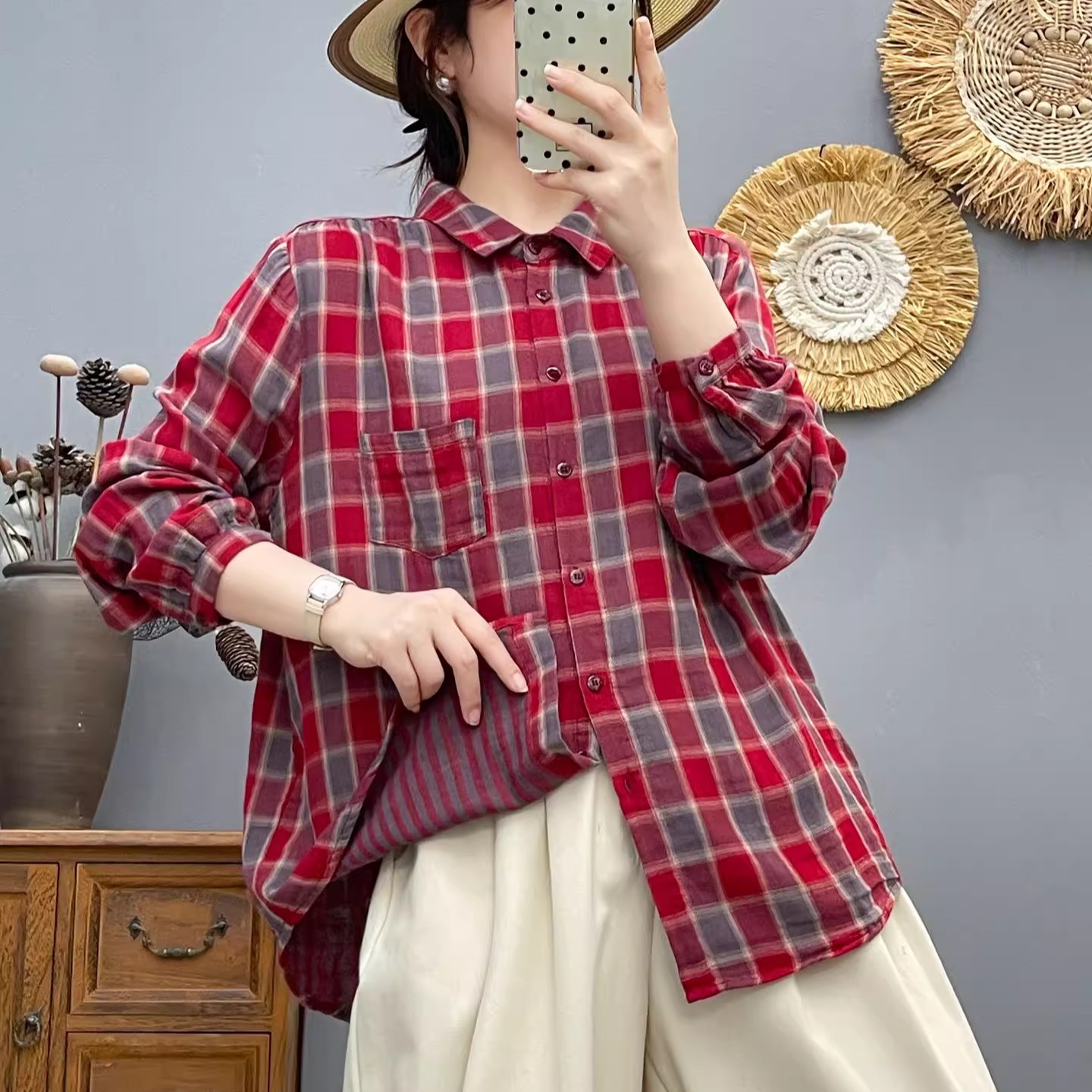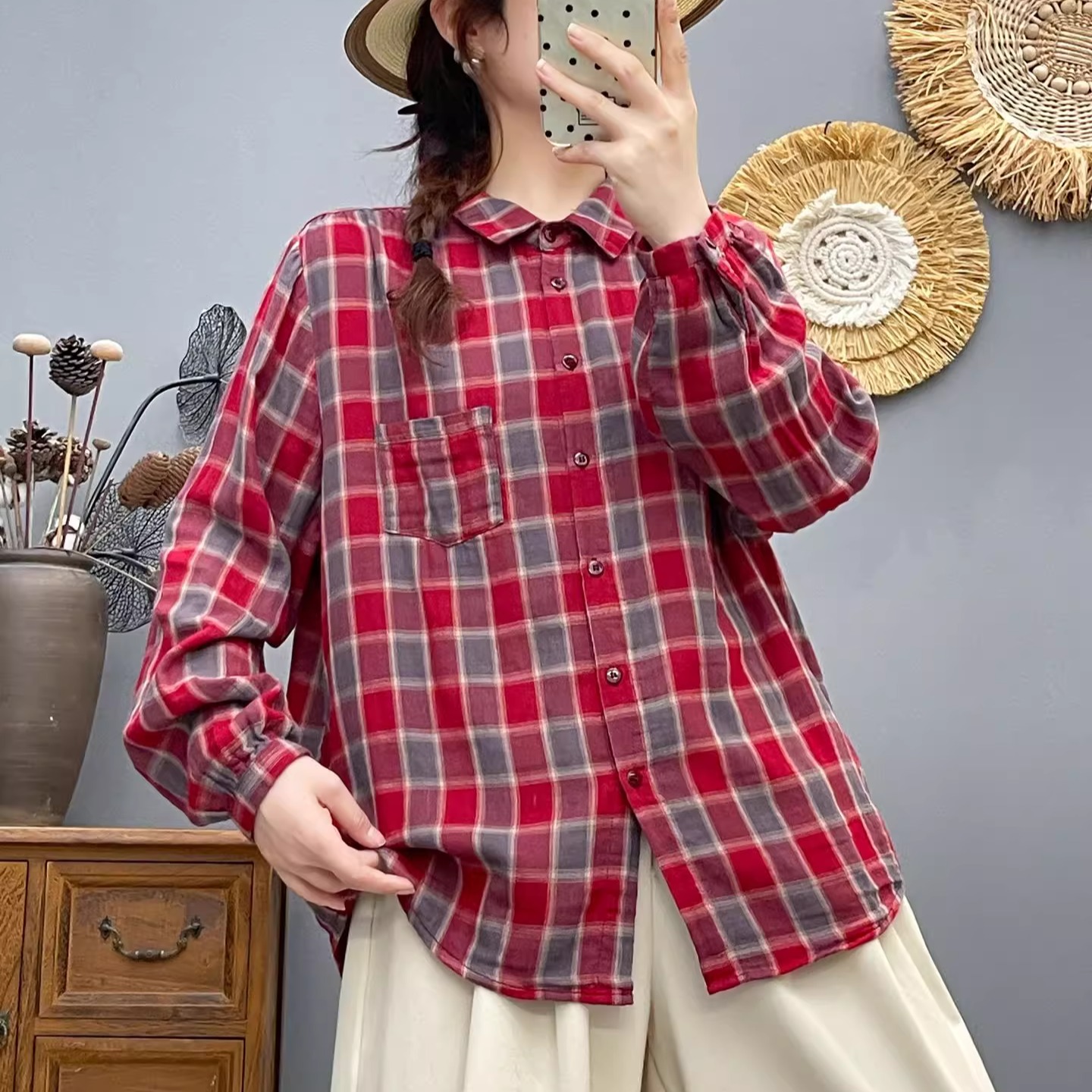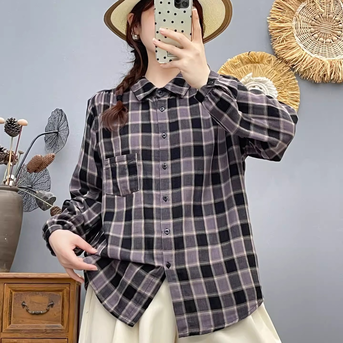 长袖格子衬衫女2025年春秋新款休闲宽松纯棉衬衣开衫外套内搭打底