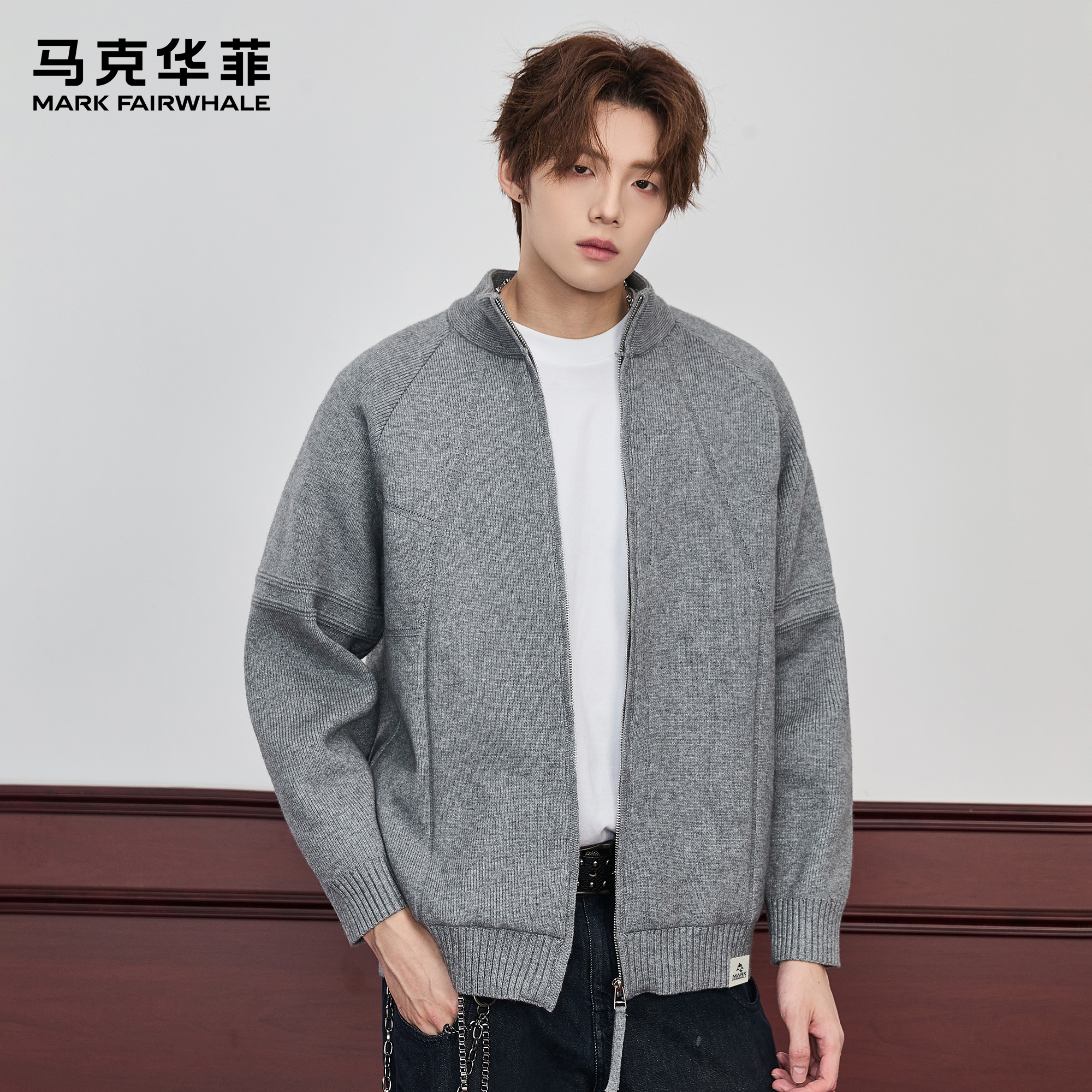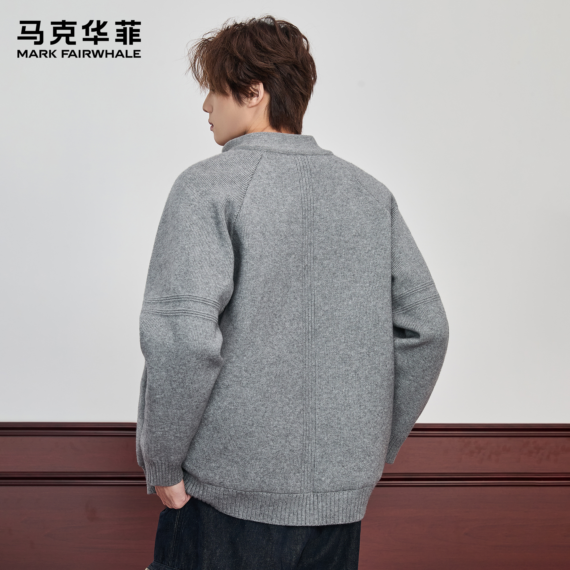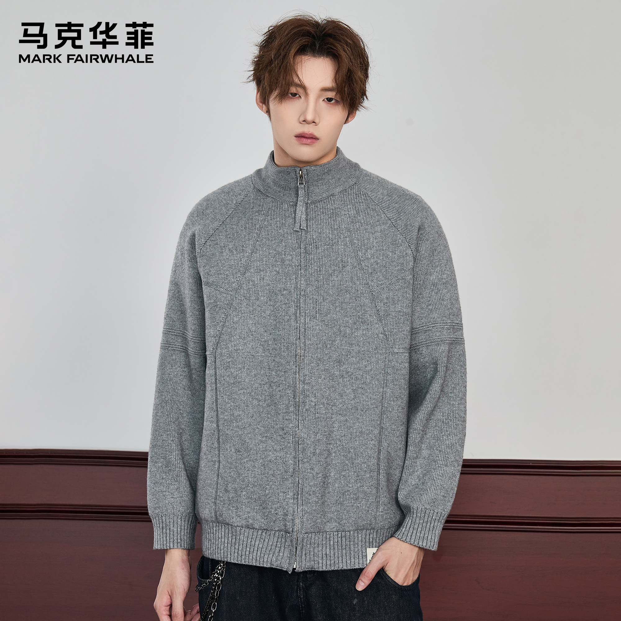 马克华菲针织开衫男2025新款时尚日系复古慵懒风灰色立领保暖毛衣