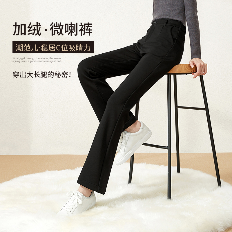 逸阳2025冬季新款保暖加绒黑色微喇女裤秋冬高腰显瘦休闲喇叭长裤