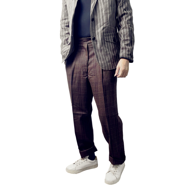 复古双褶皱漂亮暗格纹羊毛混纺厚实质感微锥剪裁直筒休闲长裤K855