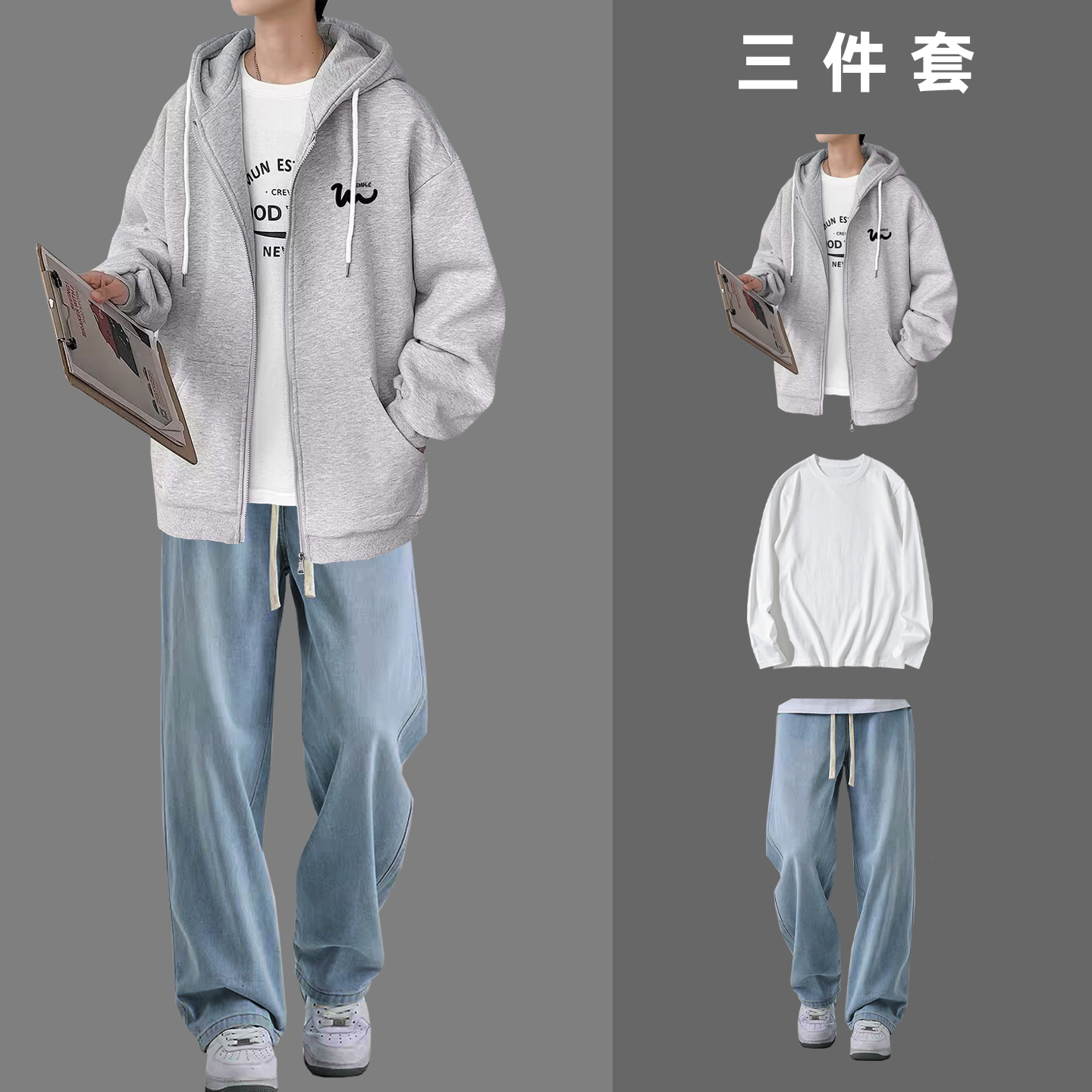 阳光帅气男生秋季套装韩版百搭开衫连帽卫衣外套潮牌酷帅穿搭男装