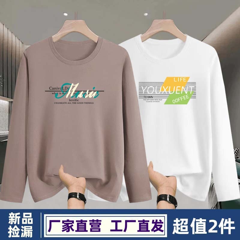 春秋季新款男士长袖T恤衫潮牌白色圆领印花宽松中年内搭打底衫男t