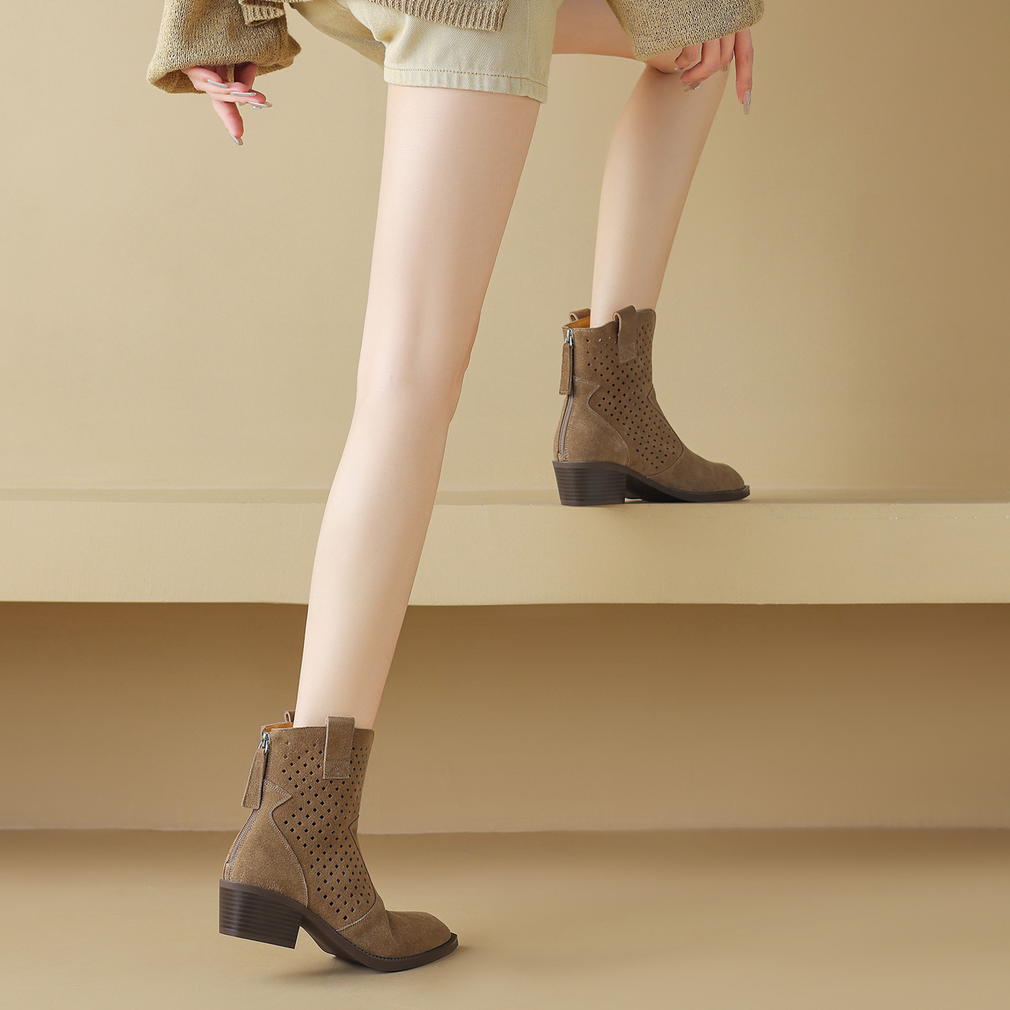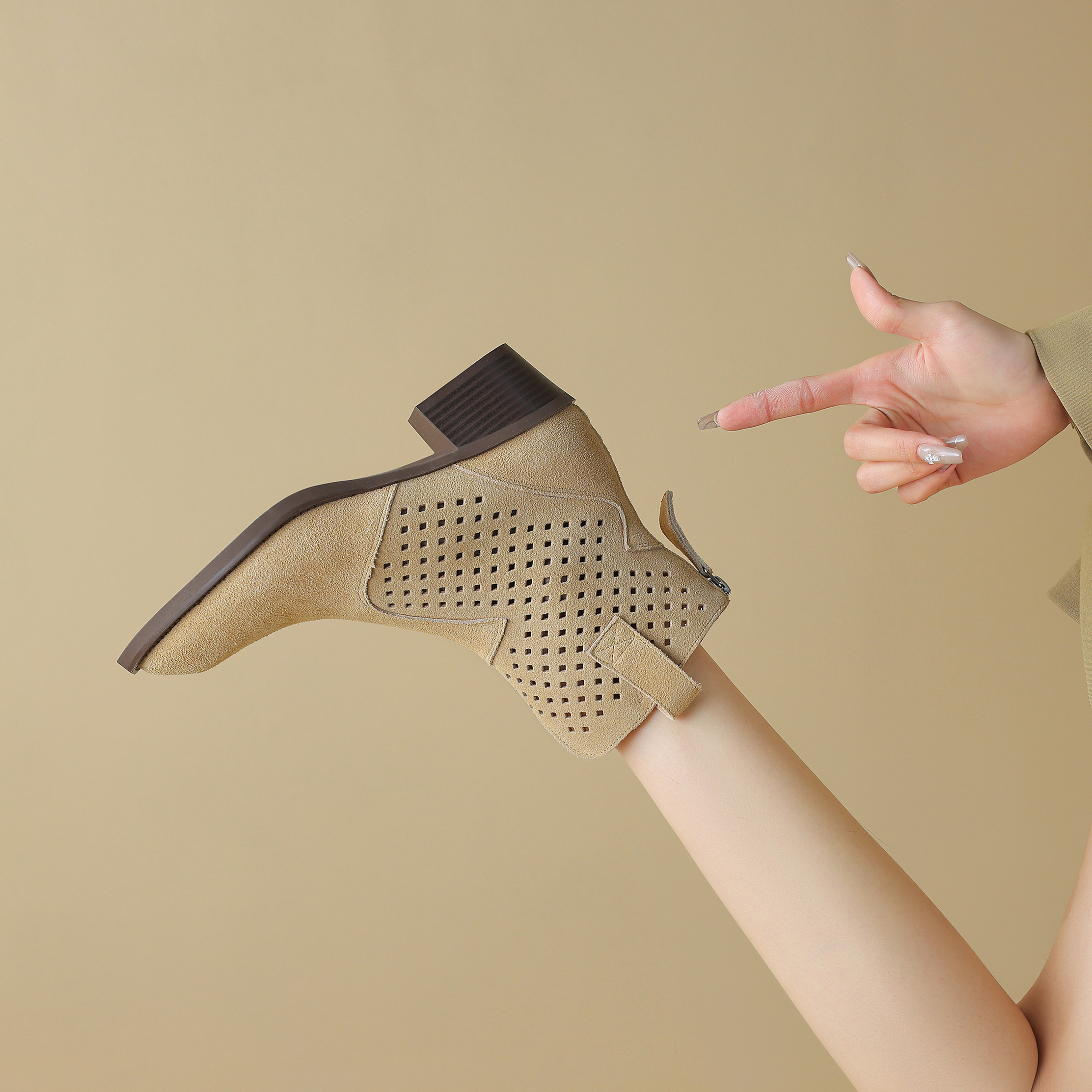 ladyblack复古镂空尖头短靴女粗跟V口显瘦西部洞洞大码凉靴子4041