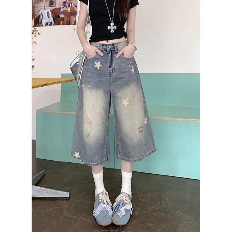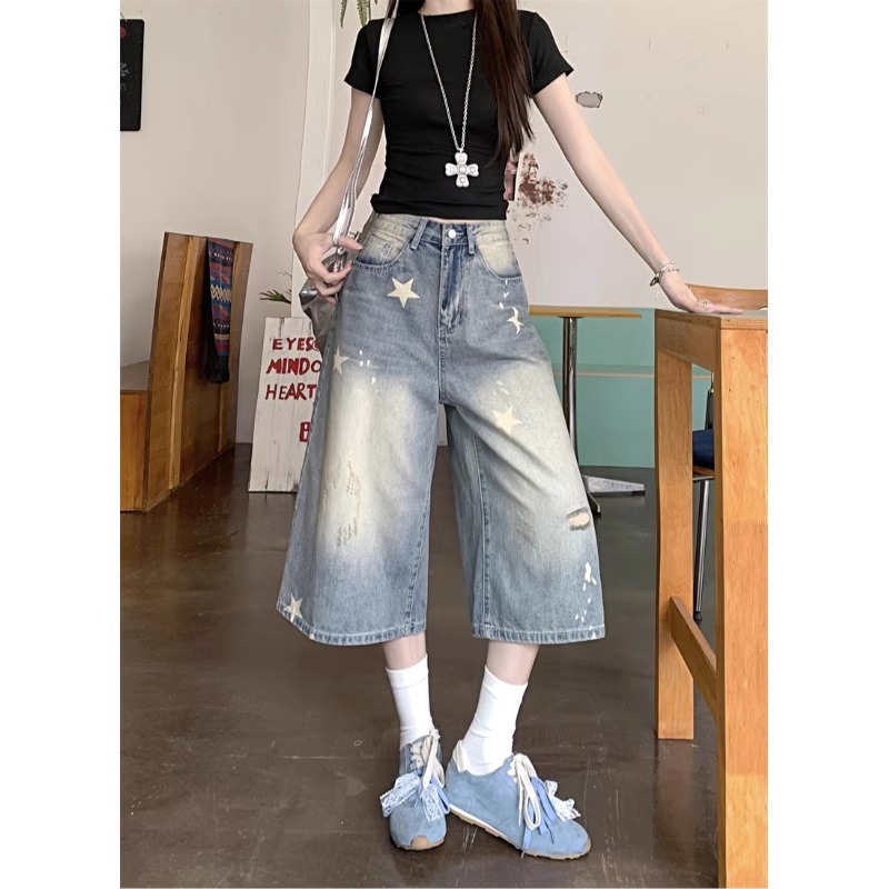 美式个性做旧星星印花设计牛仔中裤女夏季新款宽松大码阔腿七分裤