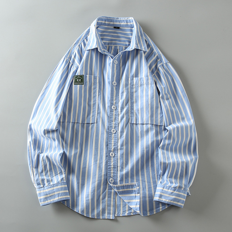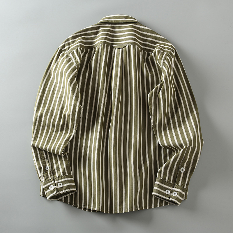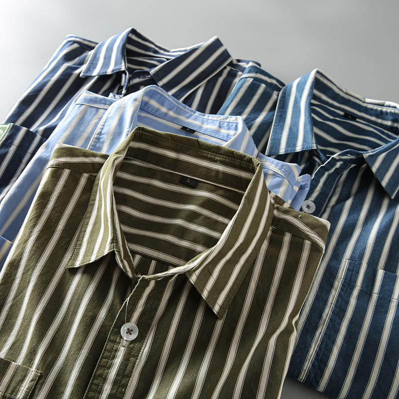 春季复古港风全棉水洗色织竖条纹男士通勤百搭休闲长袖衬衫衬衣潮