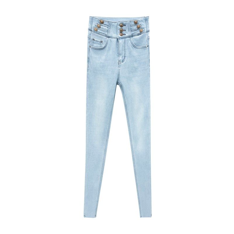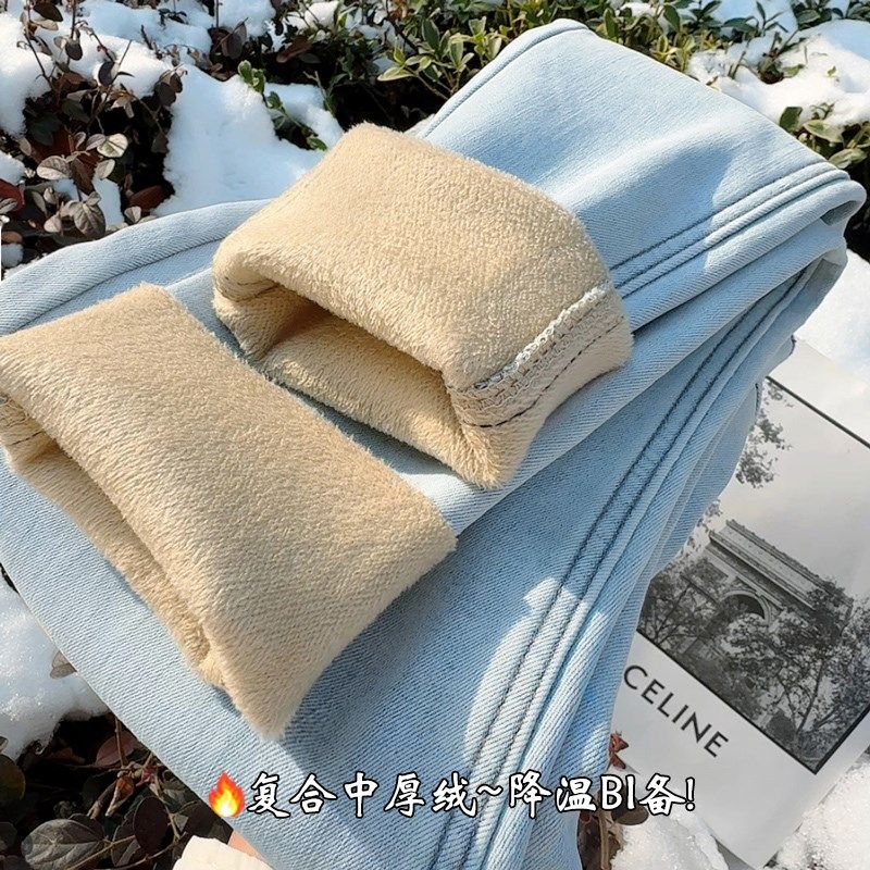 超厚款~浅色高腰加绒牛仔裤女冬季蓝白色弹力紧身显瘦小脚铅笔裤