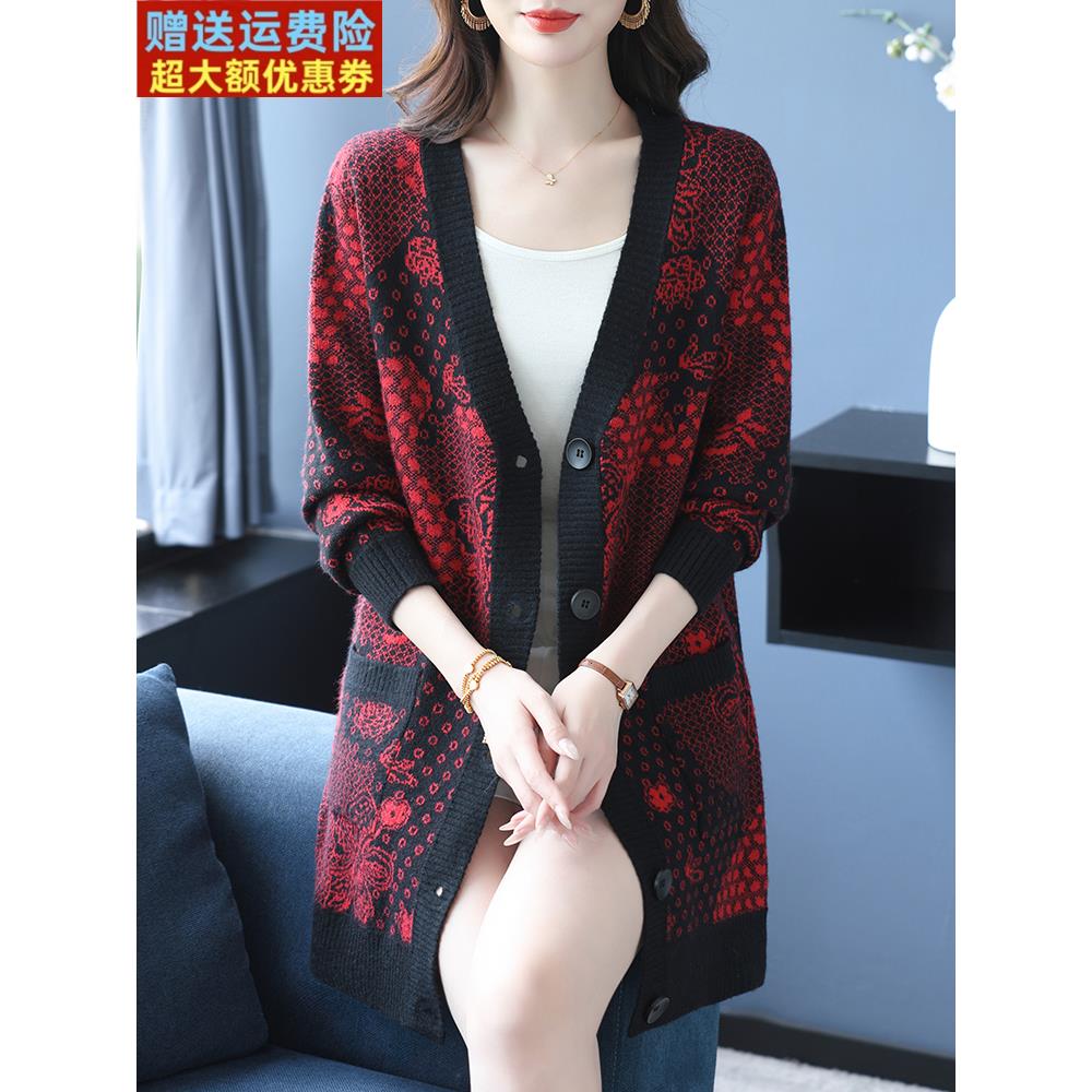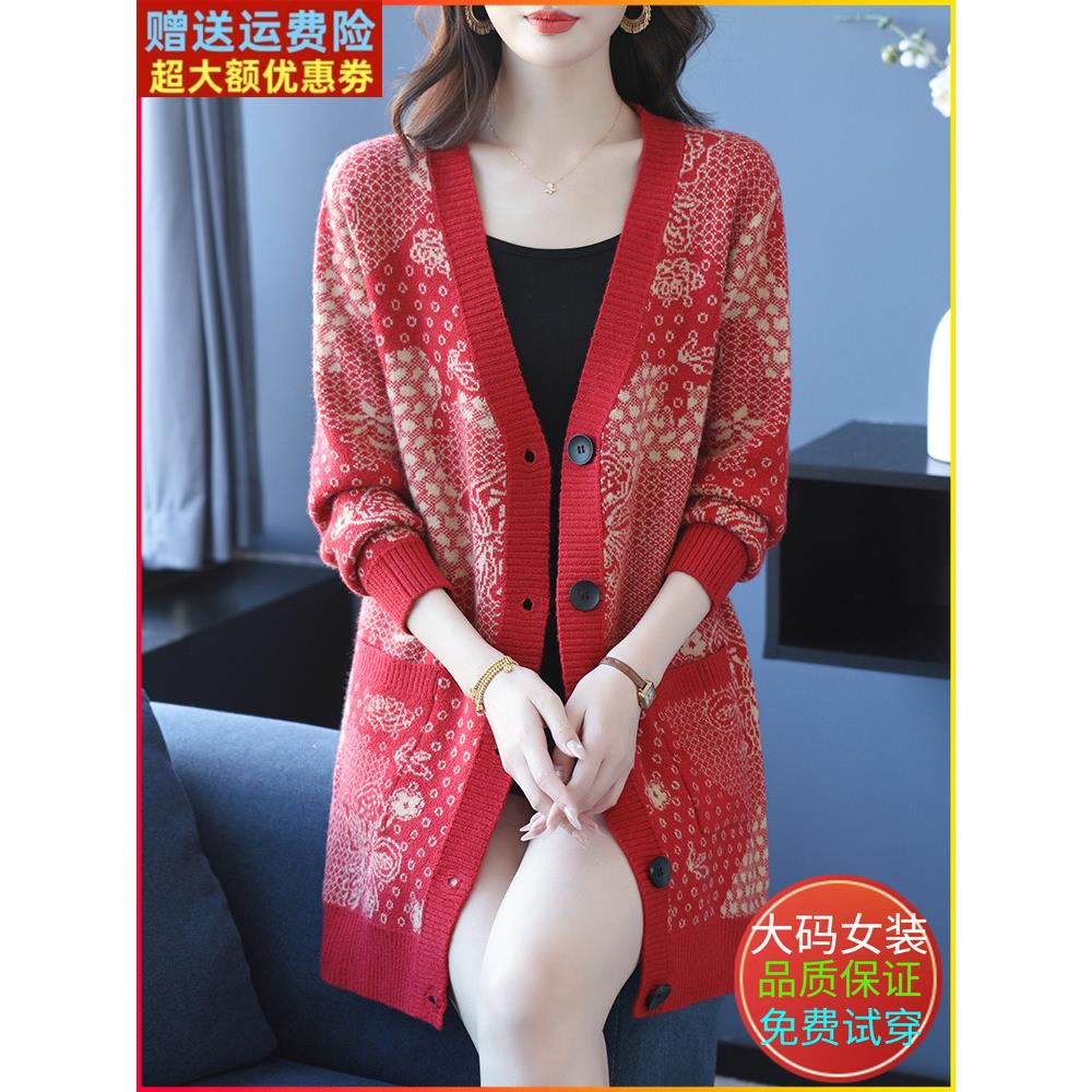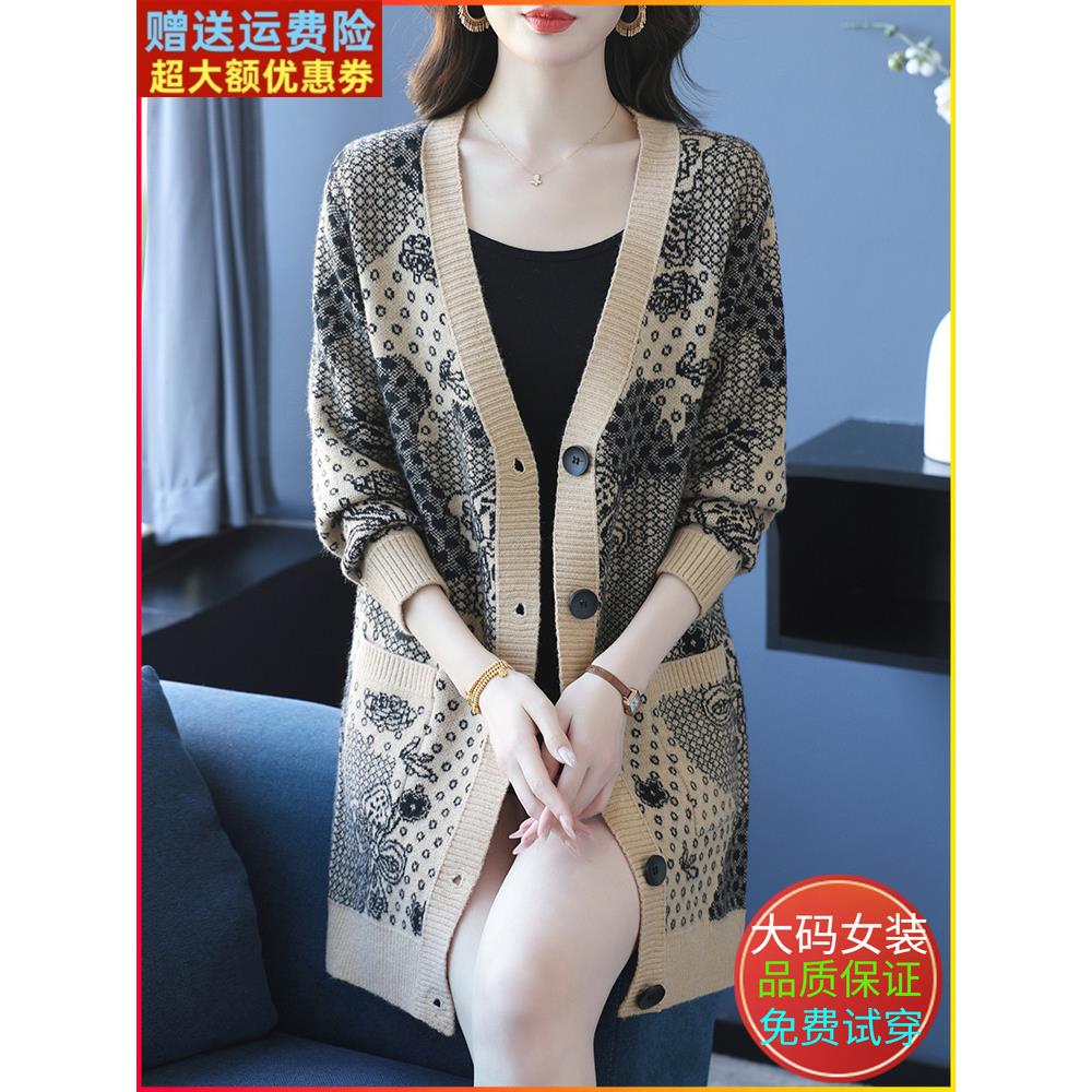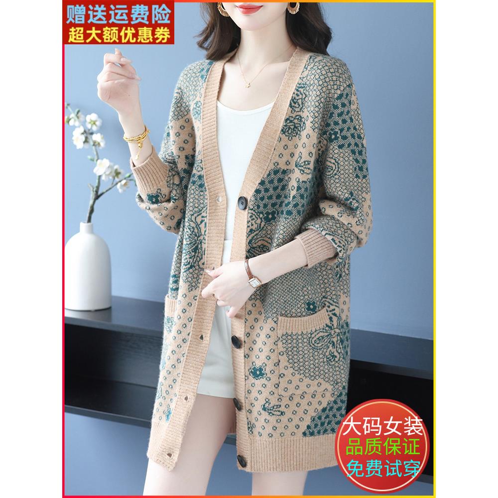 时尚提花羊毛针织开衫女秋冬中长款外搭加肥加大码毛衣外套妈妈装