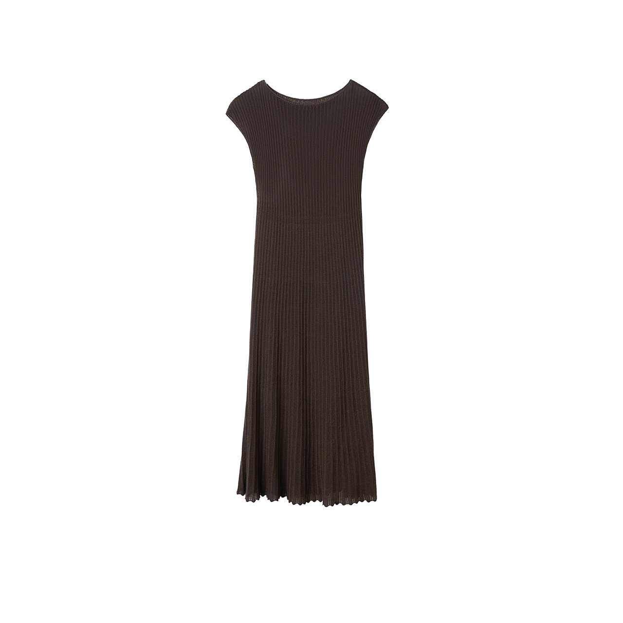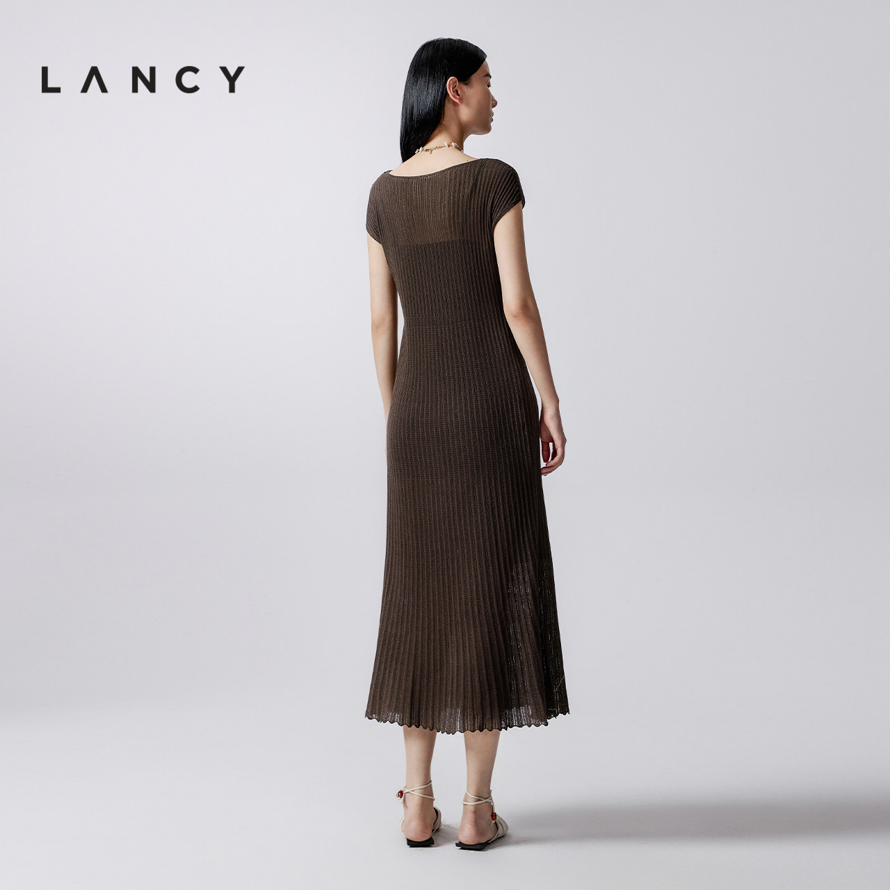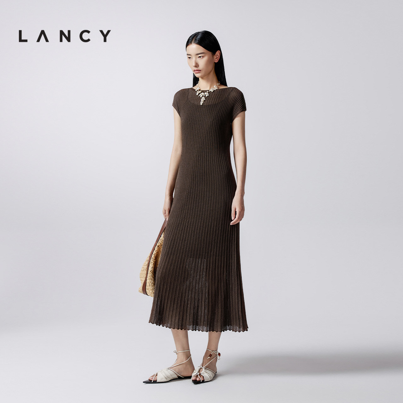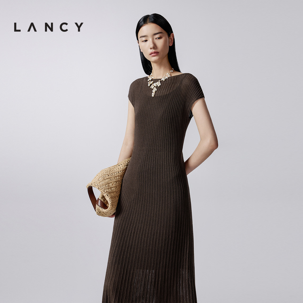 LANCY/朗姿2025年夏新款高端气质显瘦一字领短袖针织连衣裙长裙女