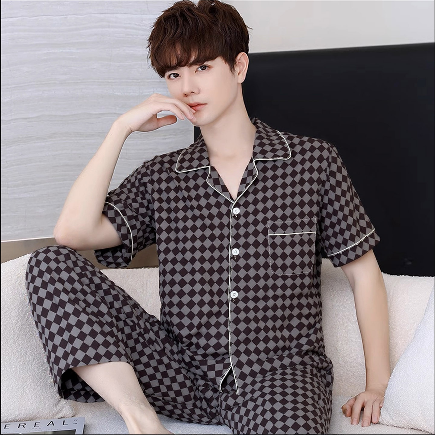 男士绵绸睡衣夏季薄款可外穿大码家居服套装春秋开衫短袖长裤棉绸