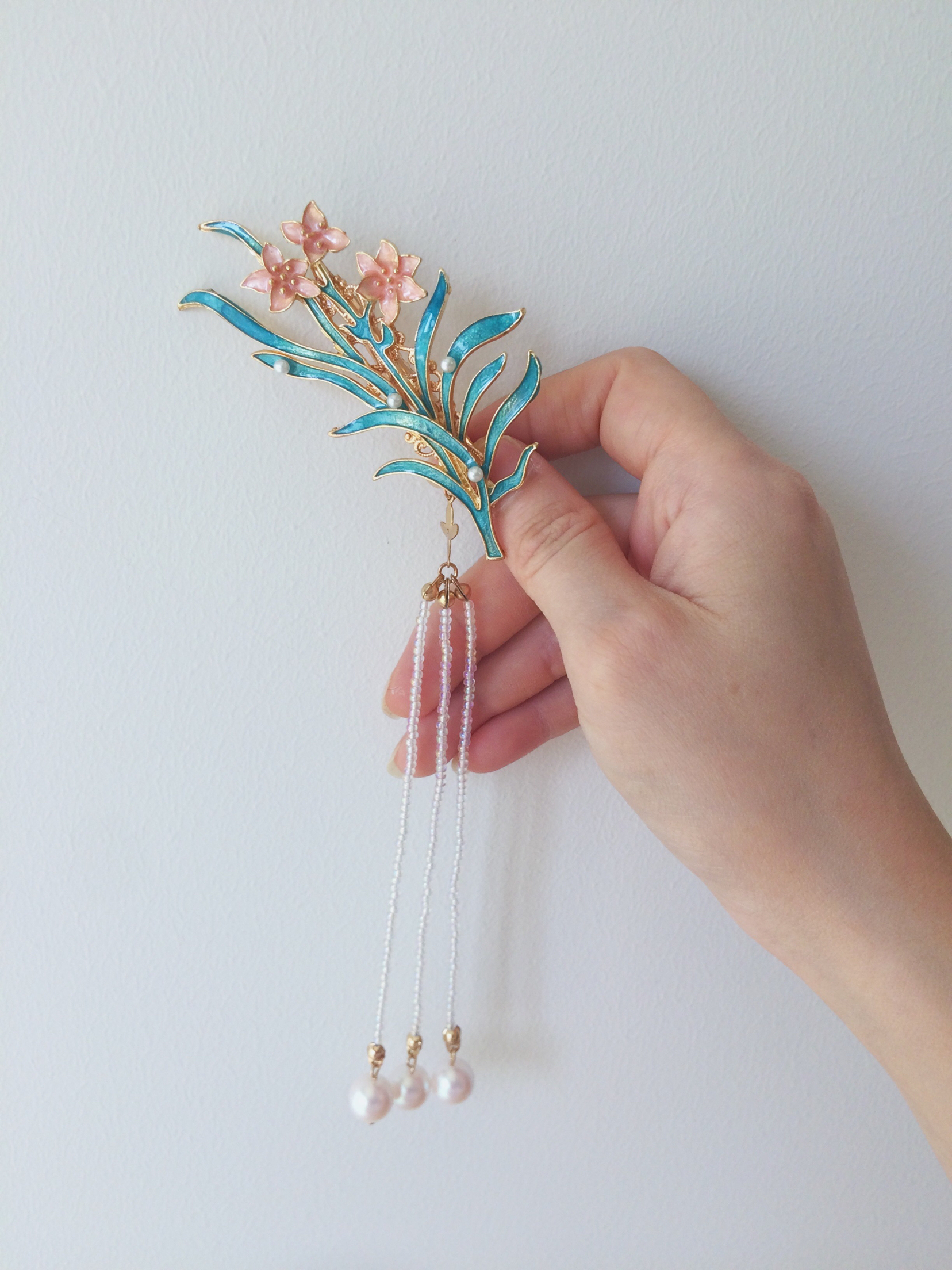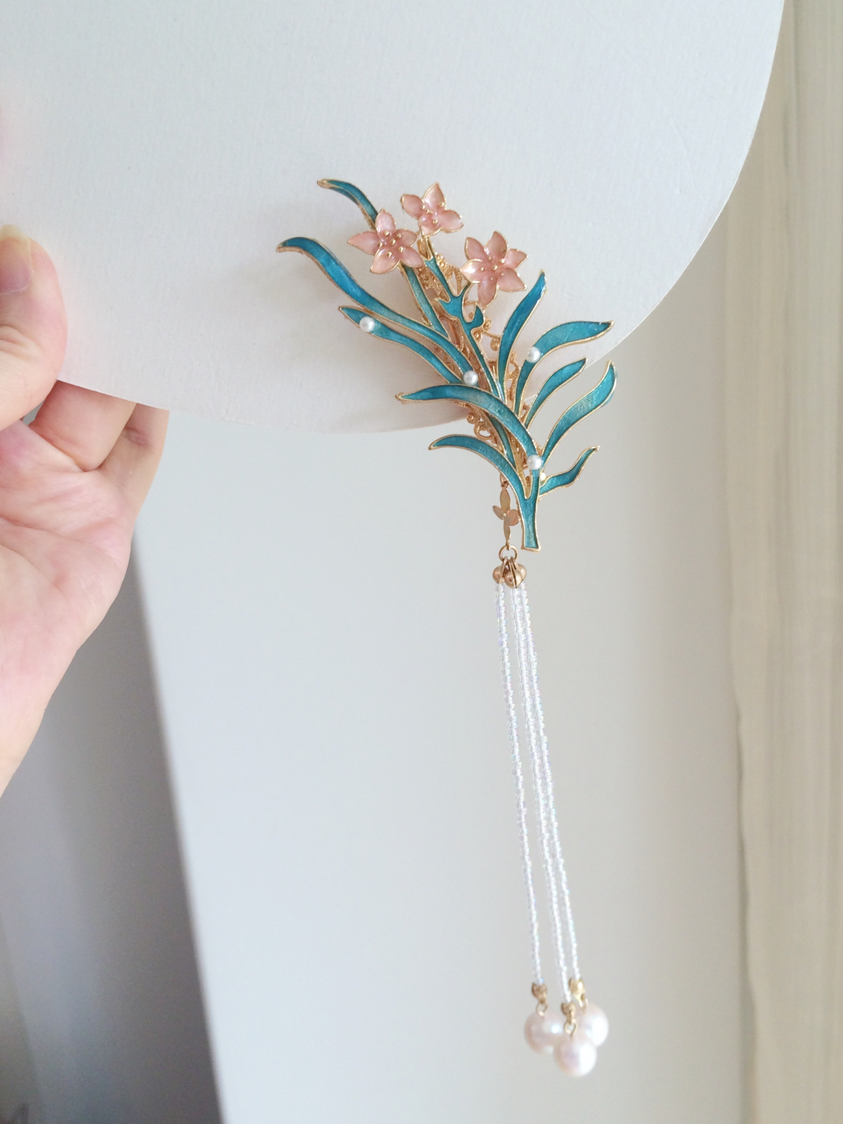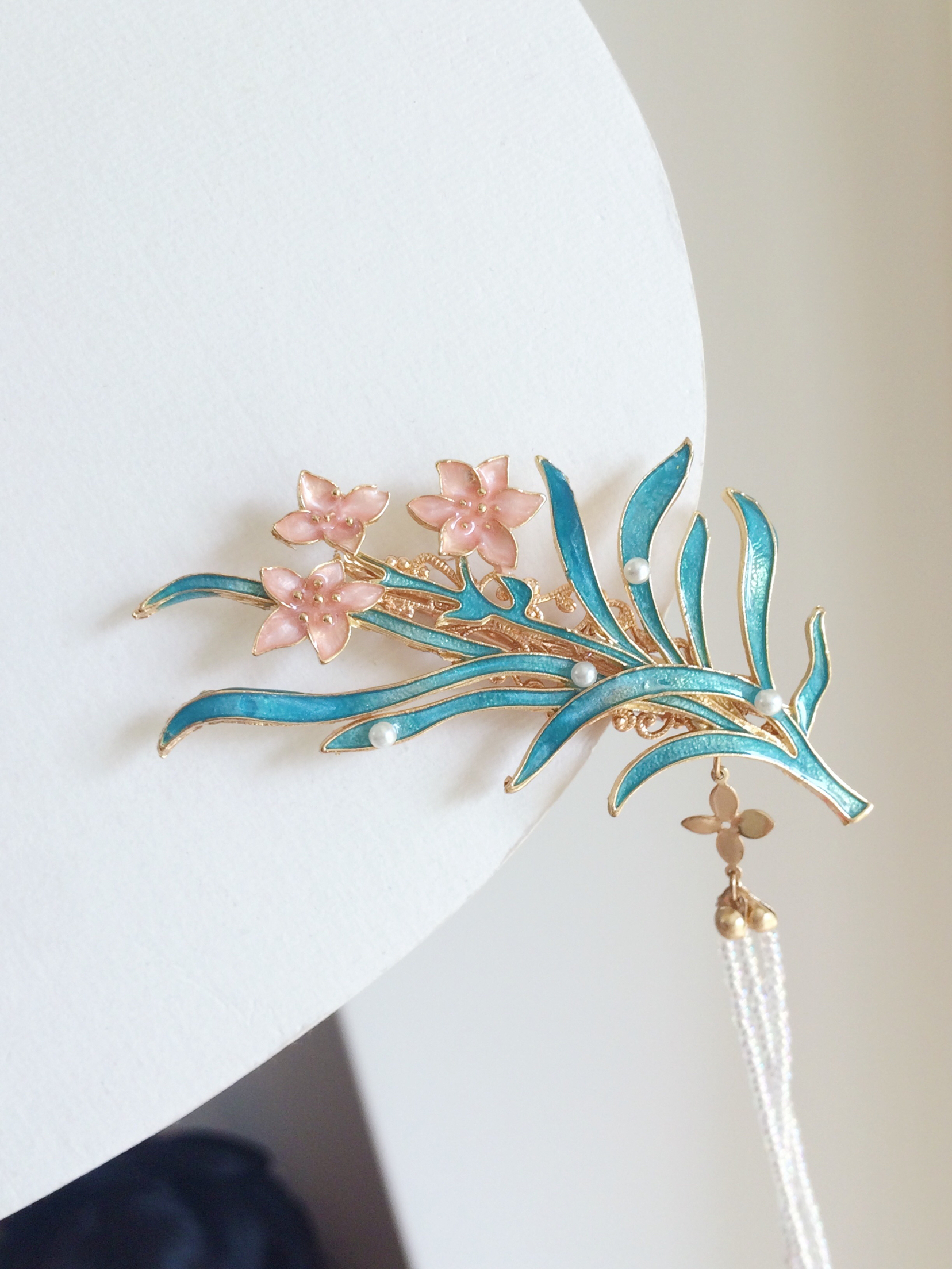 {粉水仙流苏发夹}汉服发饰发钗子中国风旗袍古风古装舞蹈发簪子