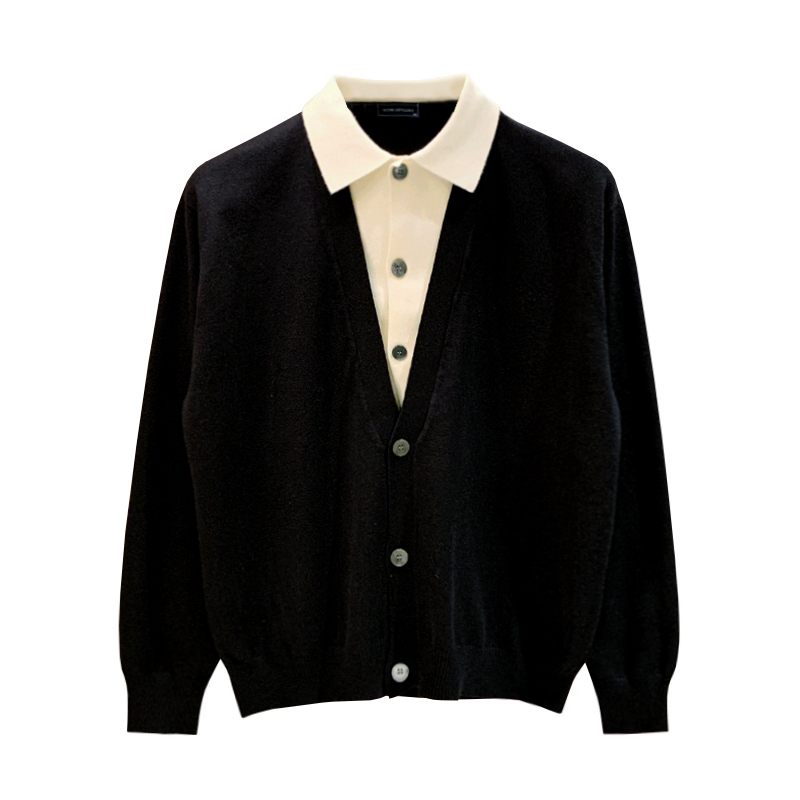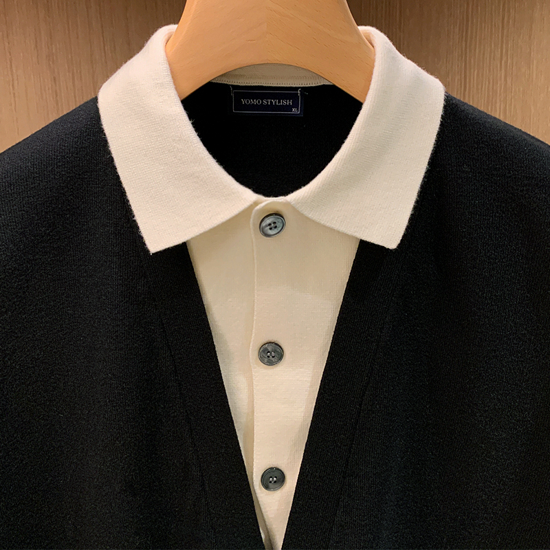 休闲拼接翻领上衣假两件毛衣外套男秋新款时尚男士高级感针织开衫
