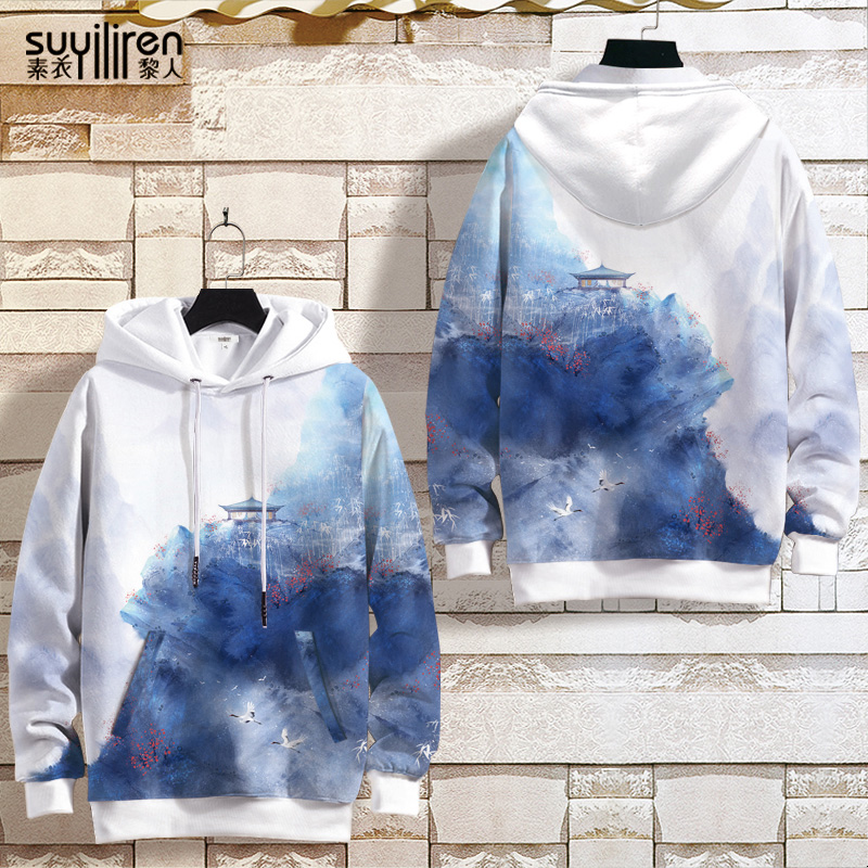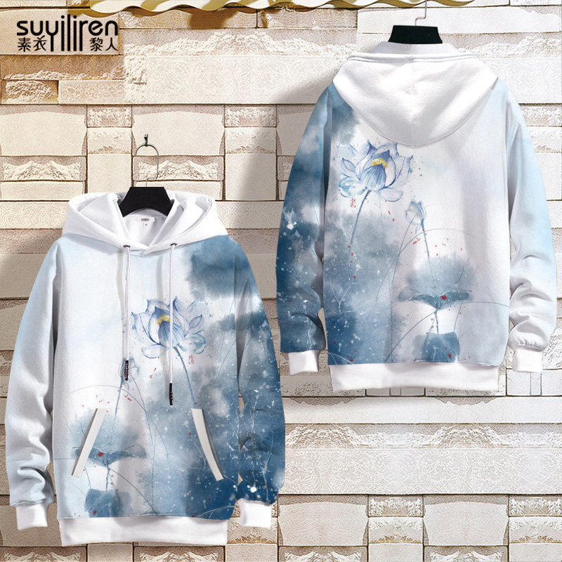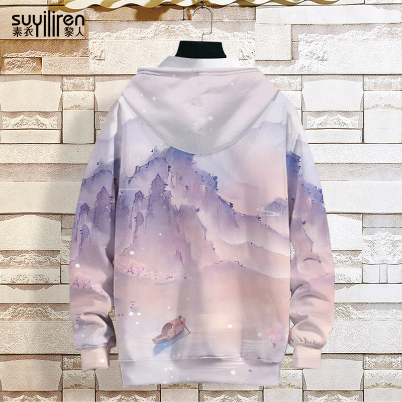 国风卫衣男士连帽秋季国潮水墨外套大码薄款上衣百搭粉色衣服休闲