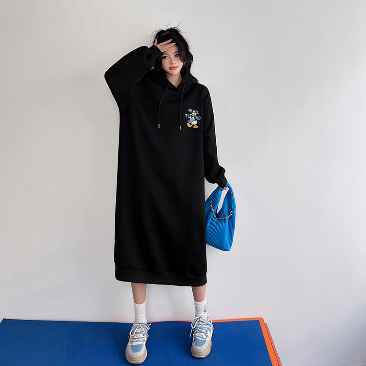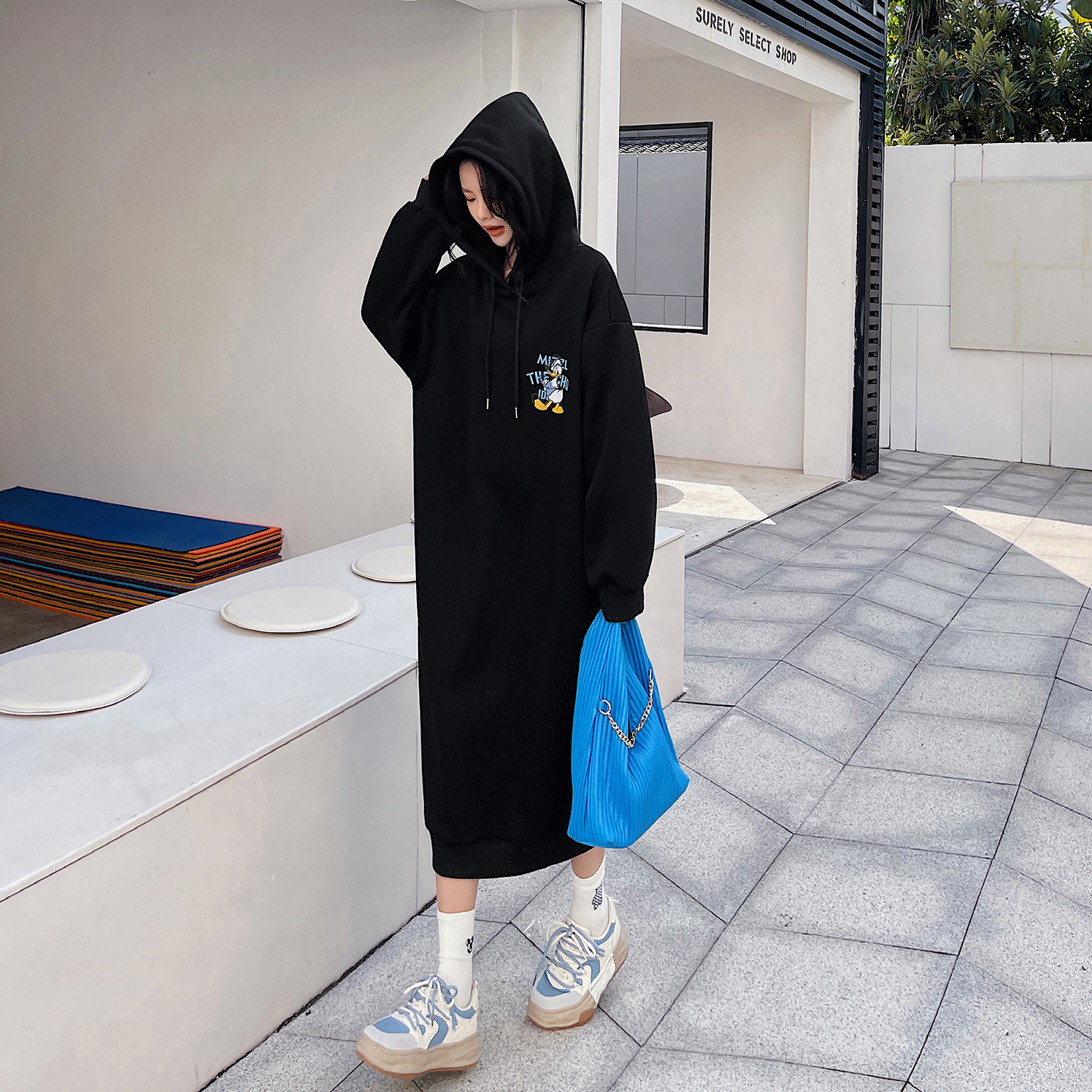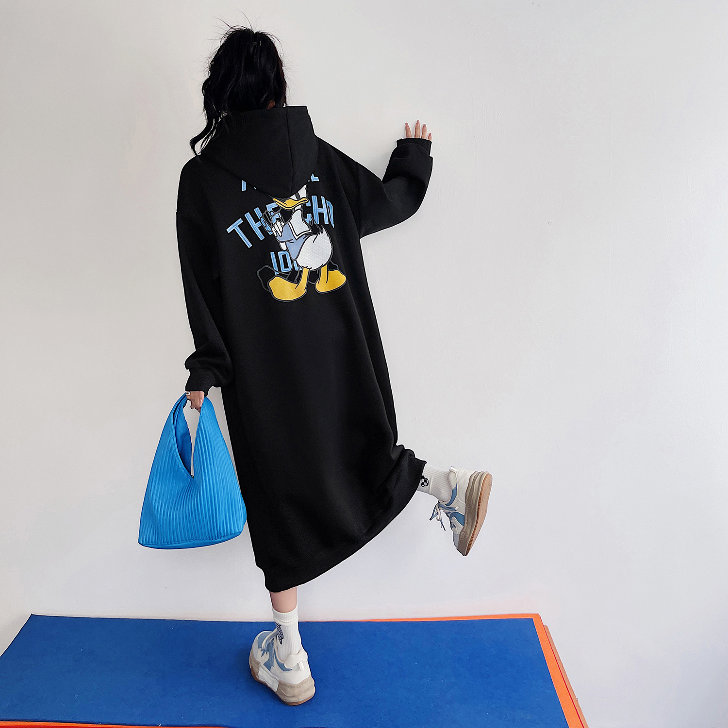 套头连帽卫衣裙女2024春秋季新款加绒加厚过膝卡通印花懒人连衣裙