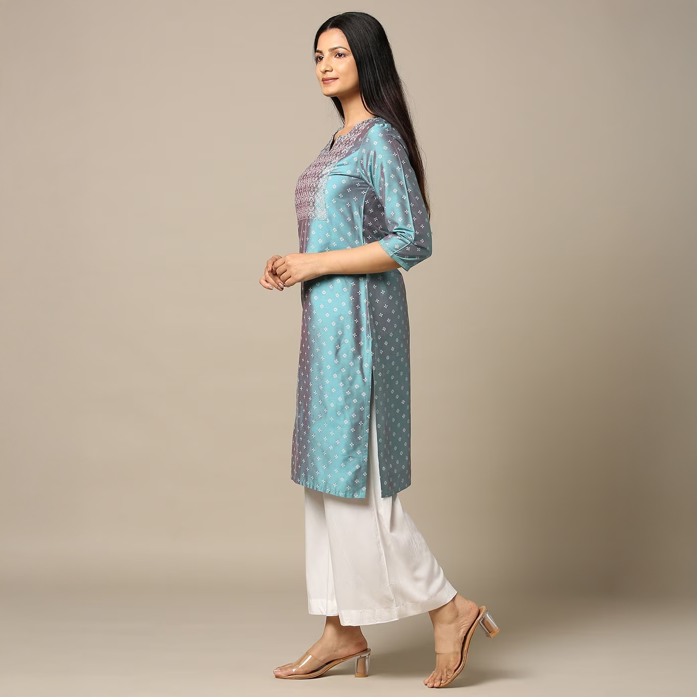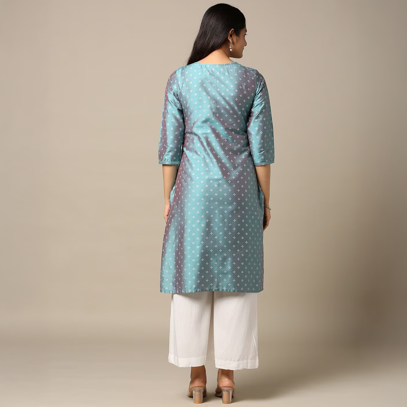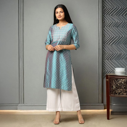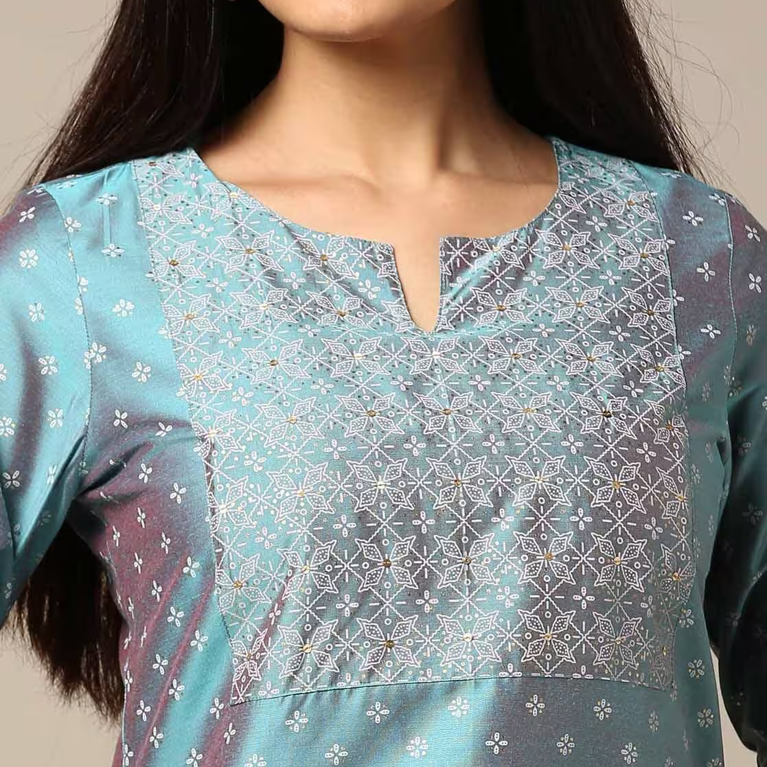 印度进口女装上衣烫金印花丝混纺中长款圆领蓝绿色宽松春夏款新品