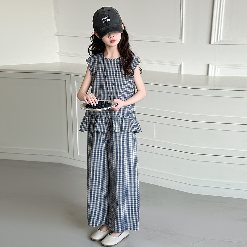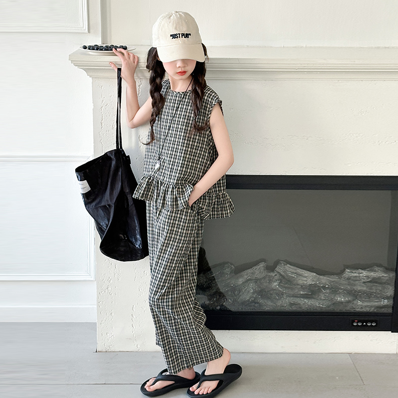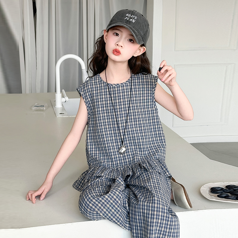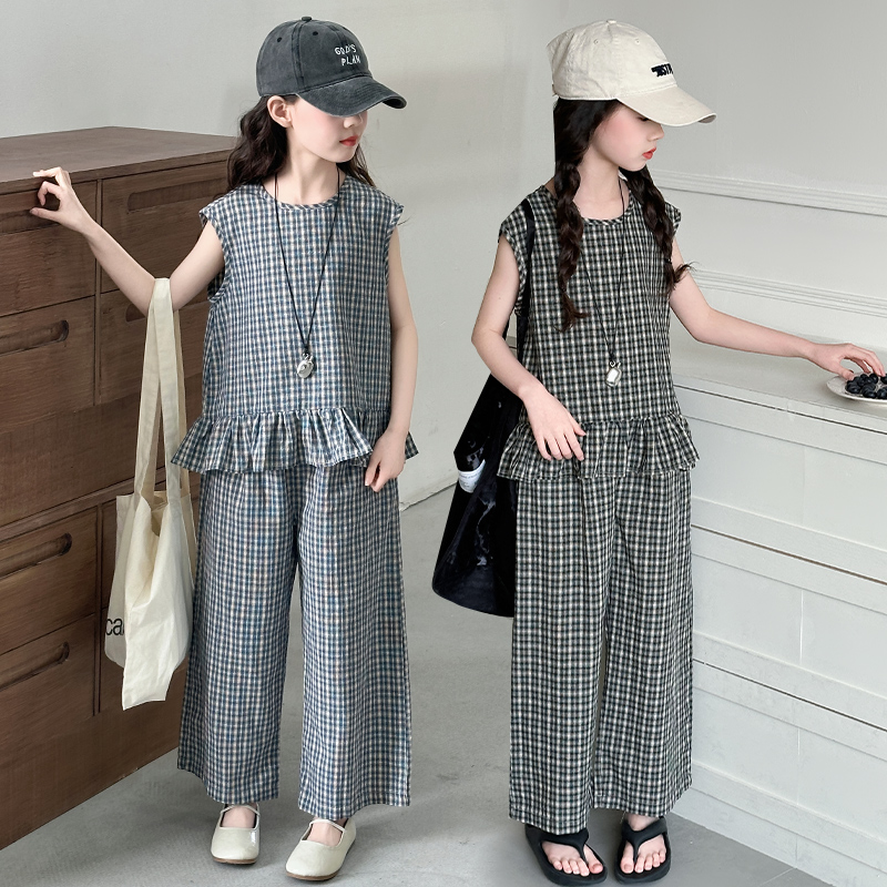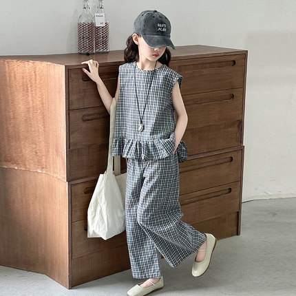 女童夏季新款韩版格子时尚无袖花边上衣休闲裤中大童两件套套装潮