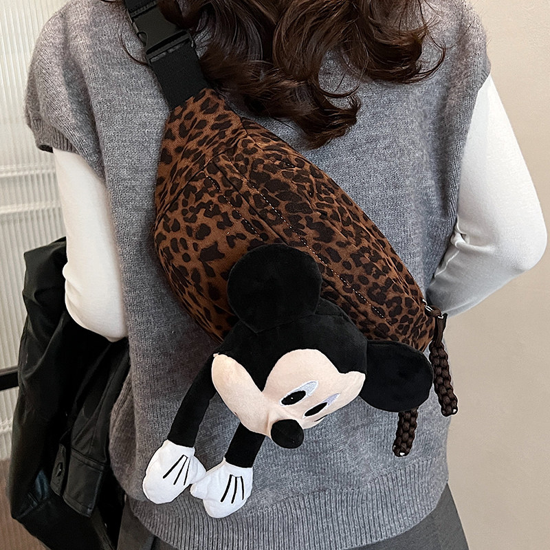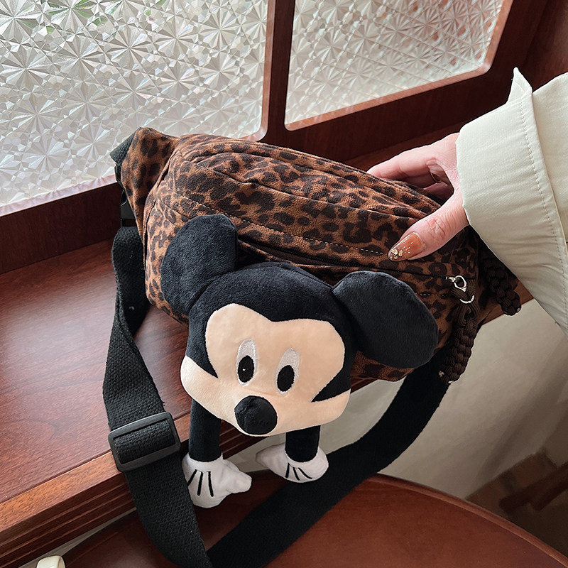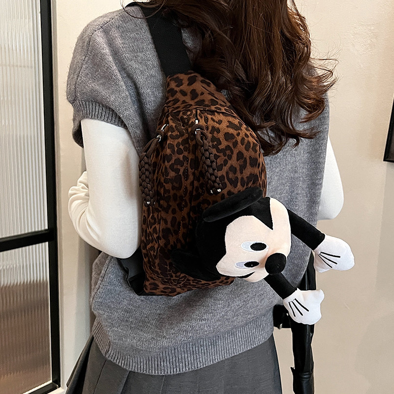 2025秋冬新款韩版女士百搭出游斜跨包豹纹时尚米奇公仔玩偶胸包女