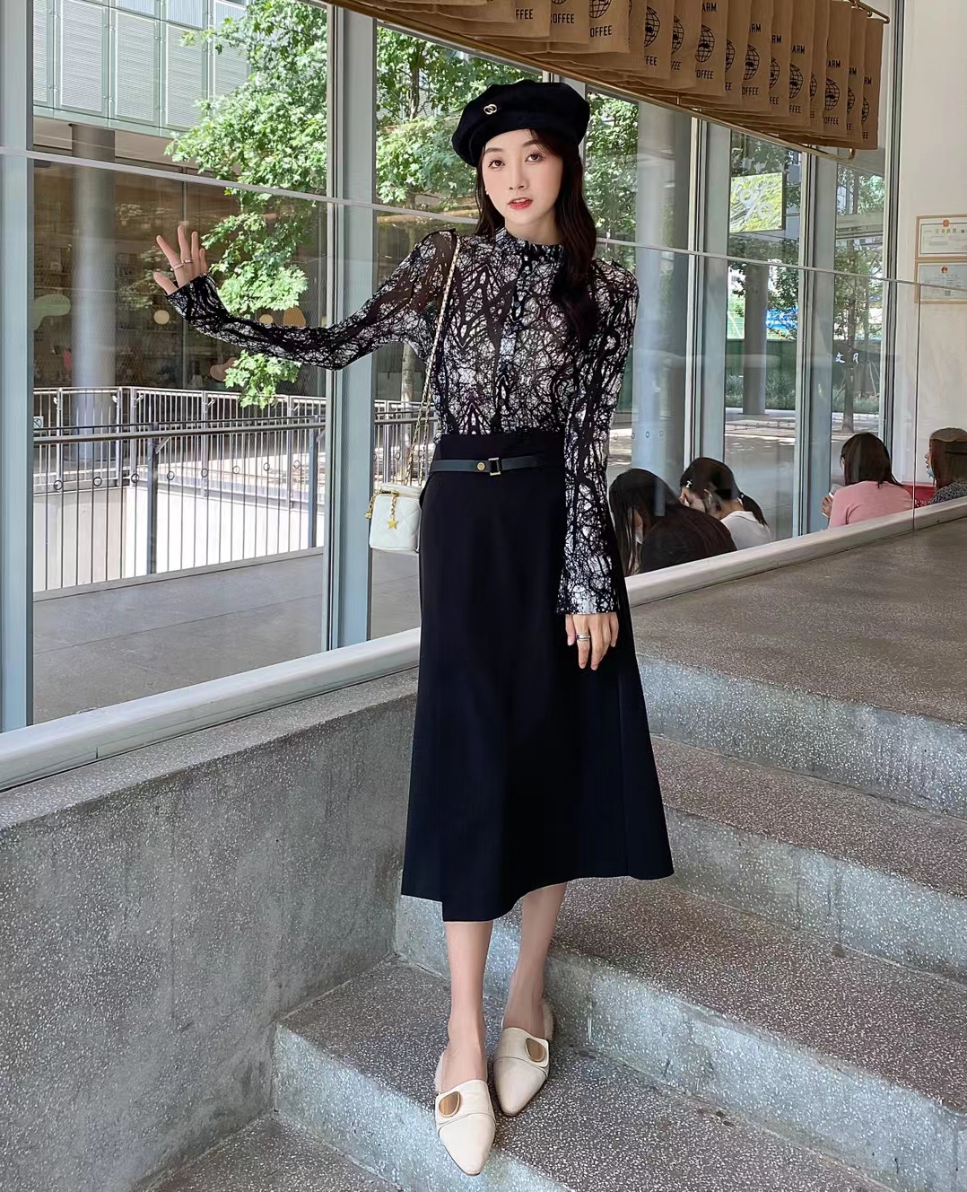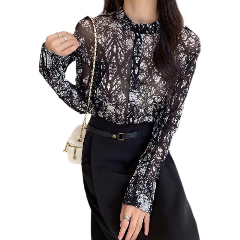 欧韩款小香风蕾丝印花衬衫女2023春季新长袖修身显瘦气质名媛小衫