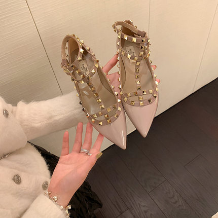 尖头浅口绑带铆钉平底鞋女单鞋