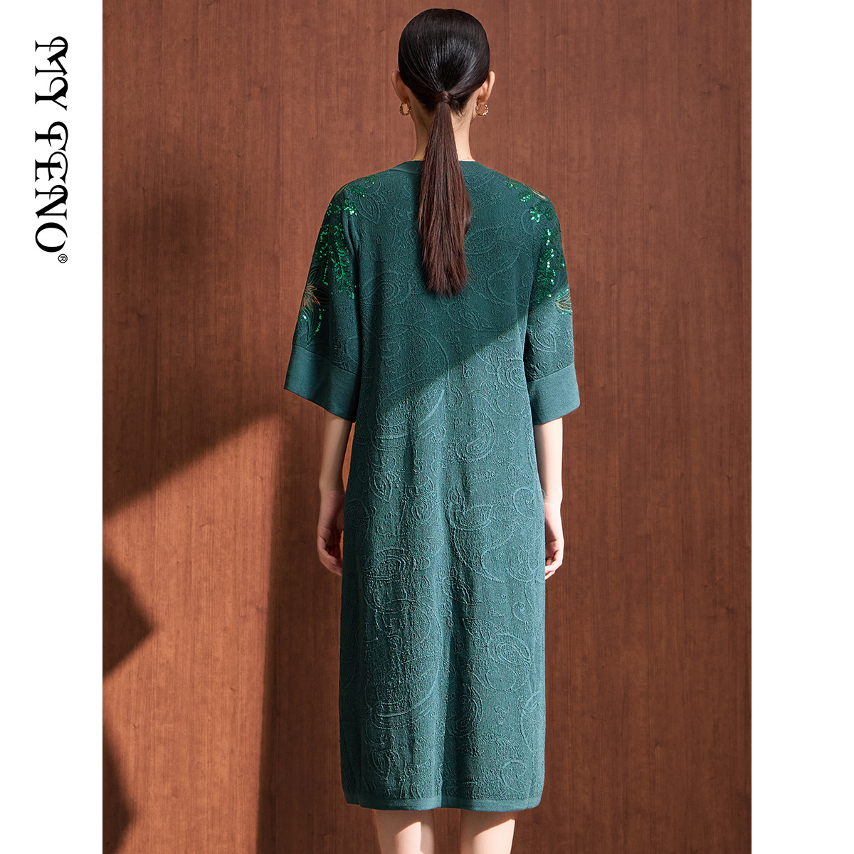 马天奴女装秋季新款绿色提花针织裙连衣裙妈妈装长裙亮片宽松裙子