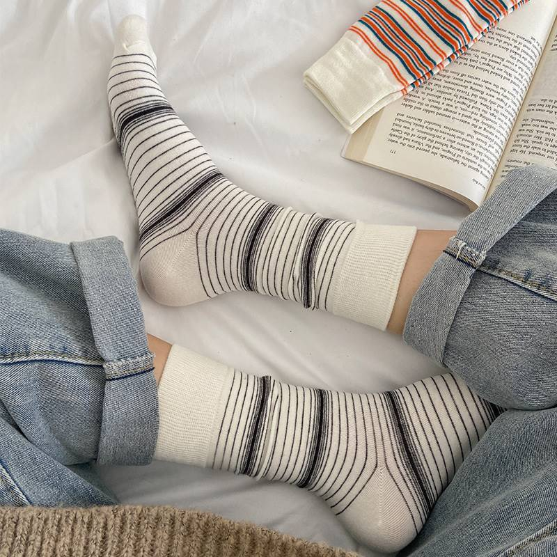 简约条纹袜子男女中筒袜ins韩国东大门运动袜日系纯棉情侣长筒袜