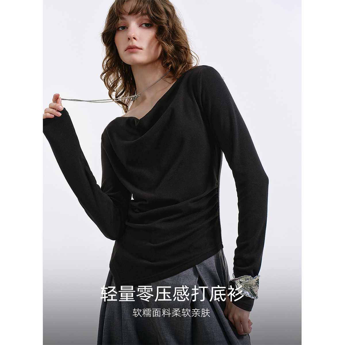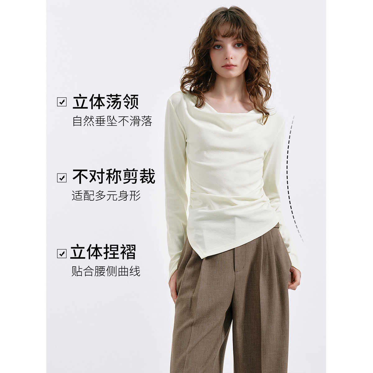 KBNE高级感荡领长袖白色t恤女2025秋季新款打底衫设计感别致上衣