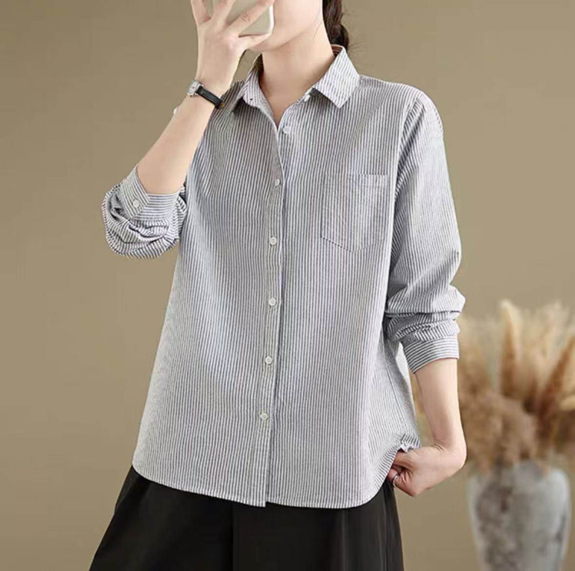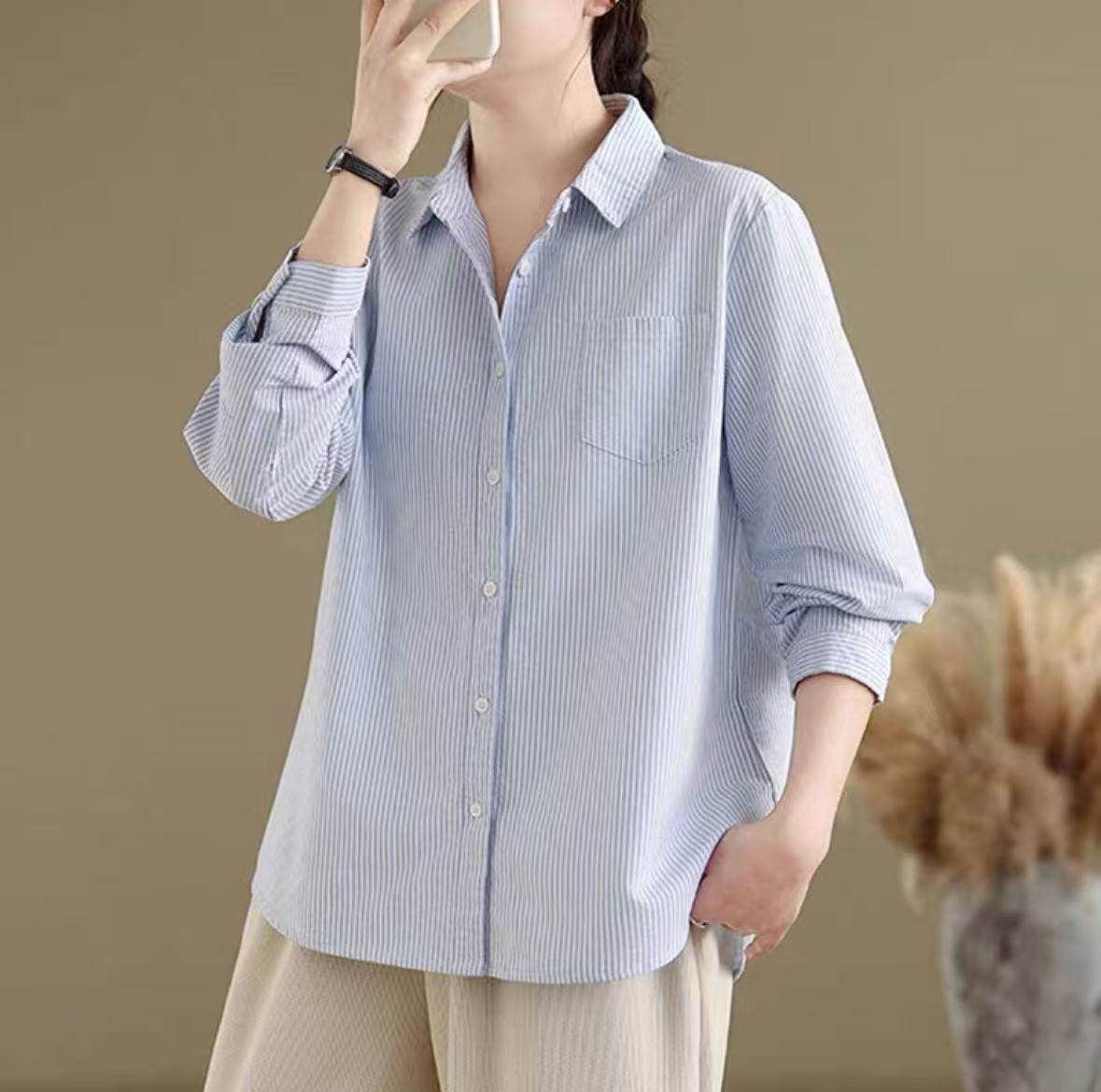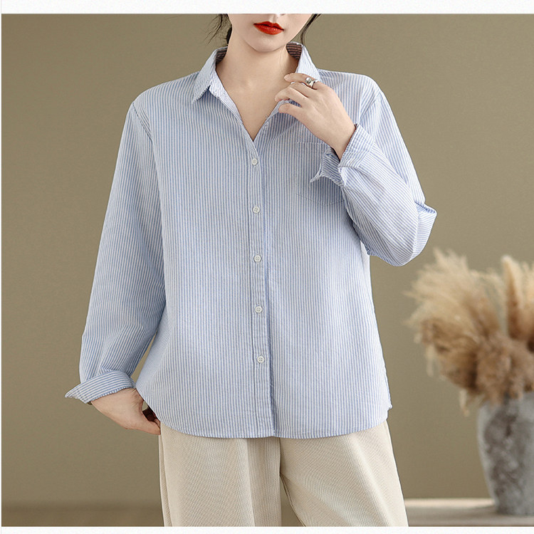 纯棉蓝色条纹衬衫女长袖小个子春季新款宽松休闲内搭叠穿打底衬衣