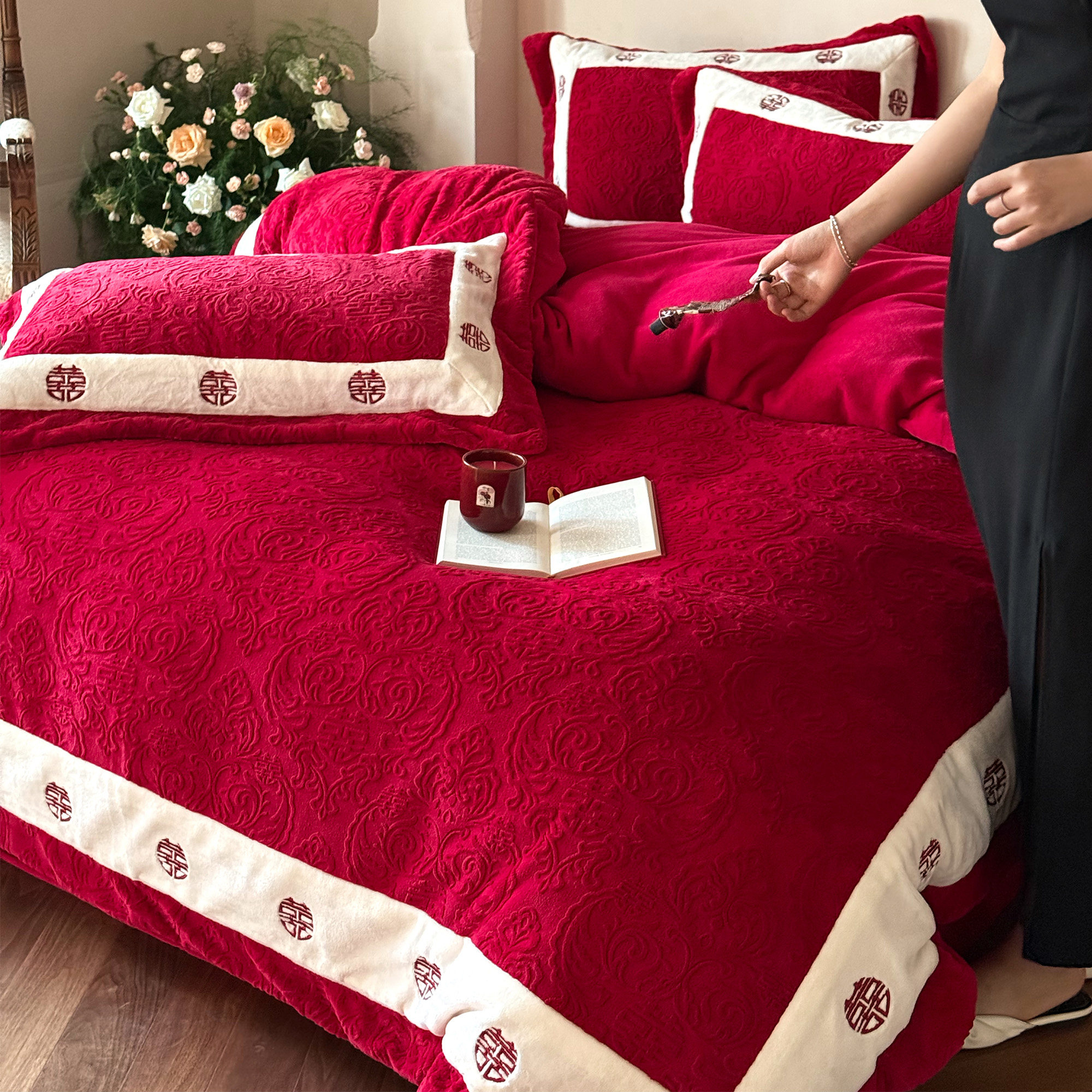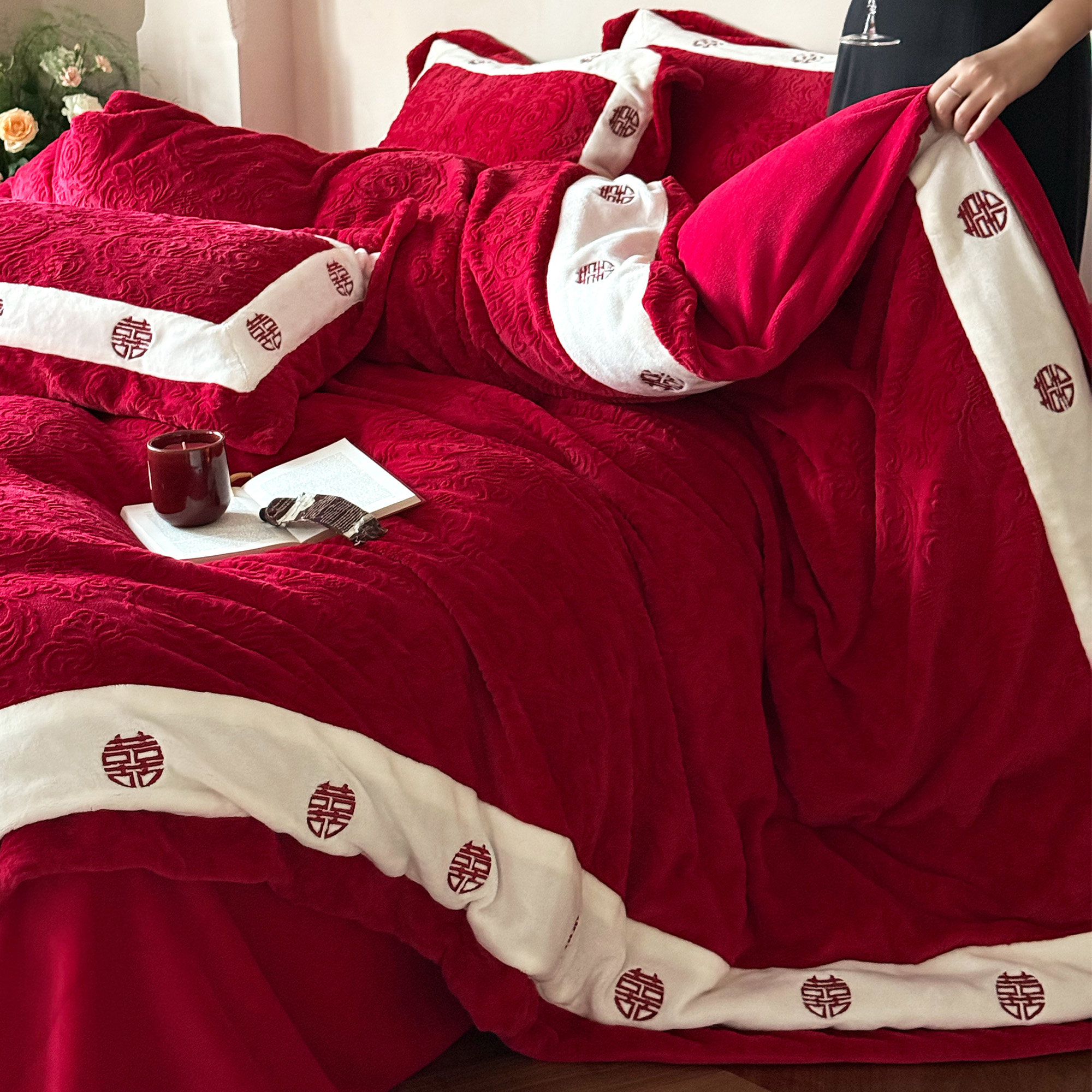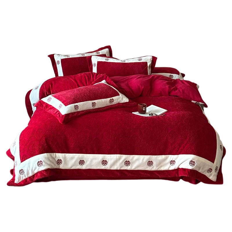 秋冬保暖红色雕花绒婚庆四件套喜字刺绣230g牛奶绒结婚被套床单笠