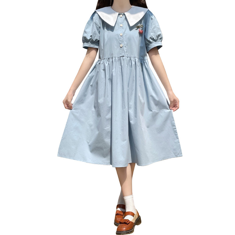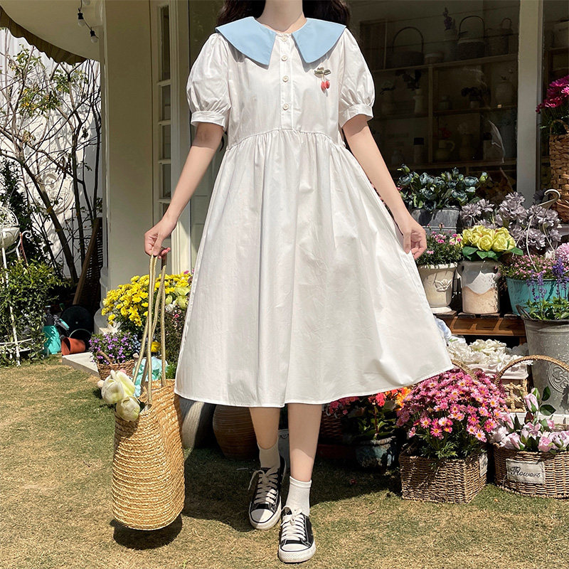 初中高中学生少女孩娃娃领刺绣连衣裙夏宽松休闲修身收腰显瘦长裙