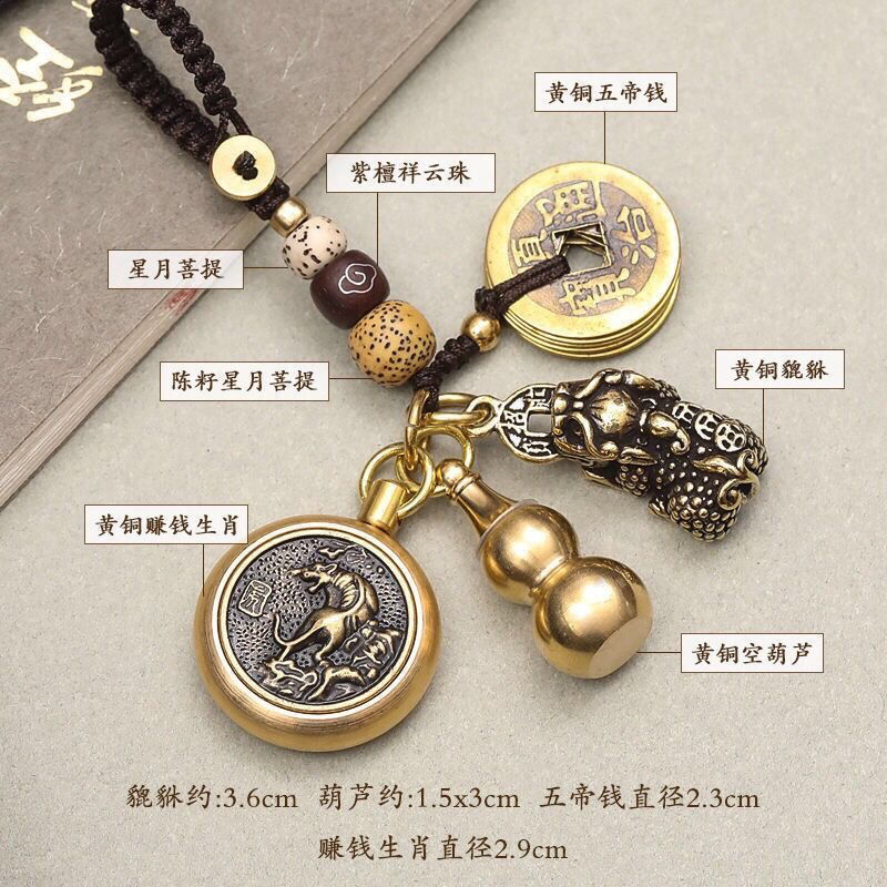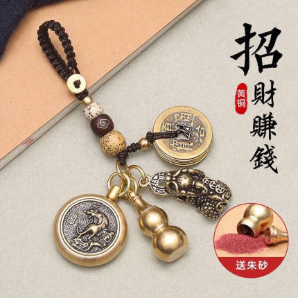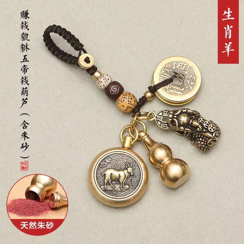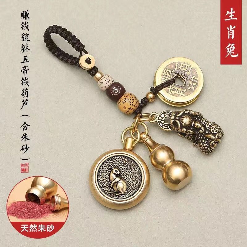 纯黄铜貔貅葫芦钥匙扣十二生肖朱砂五帝钱汽车挂件饰品链男士吊坠