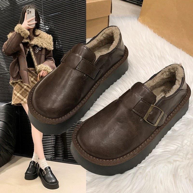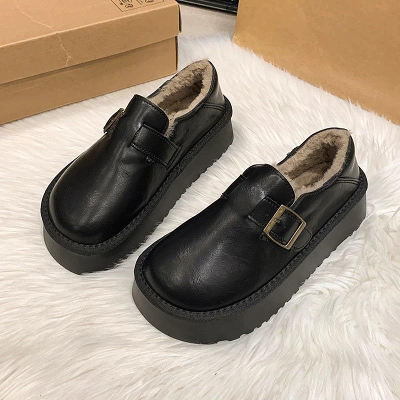 厚底皮面勃肯鞋女2025秋冬季新款加绒保暖豆豆乐福鞋毛毛雪地棉鞋
