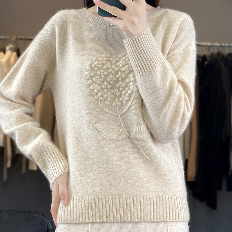 秋冬圆领刺绣钩花100%纯羊毛衫