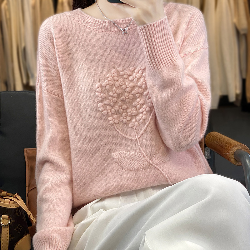 100%纯羊毛衫女圆领手工刺绣钩花针织毛衣秋冬宽松羊绒衫打底上衣