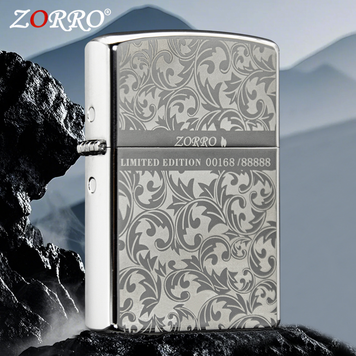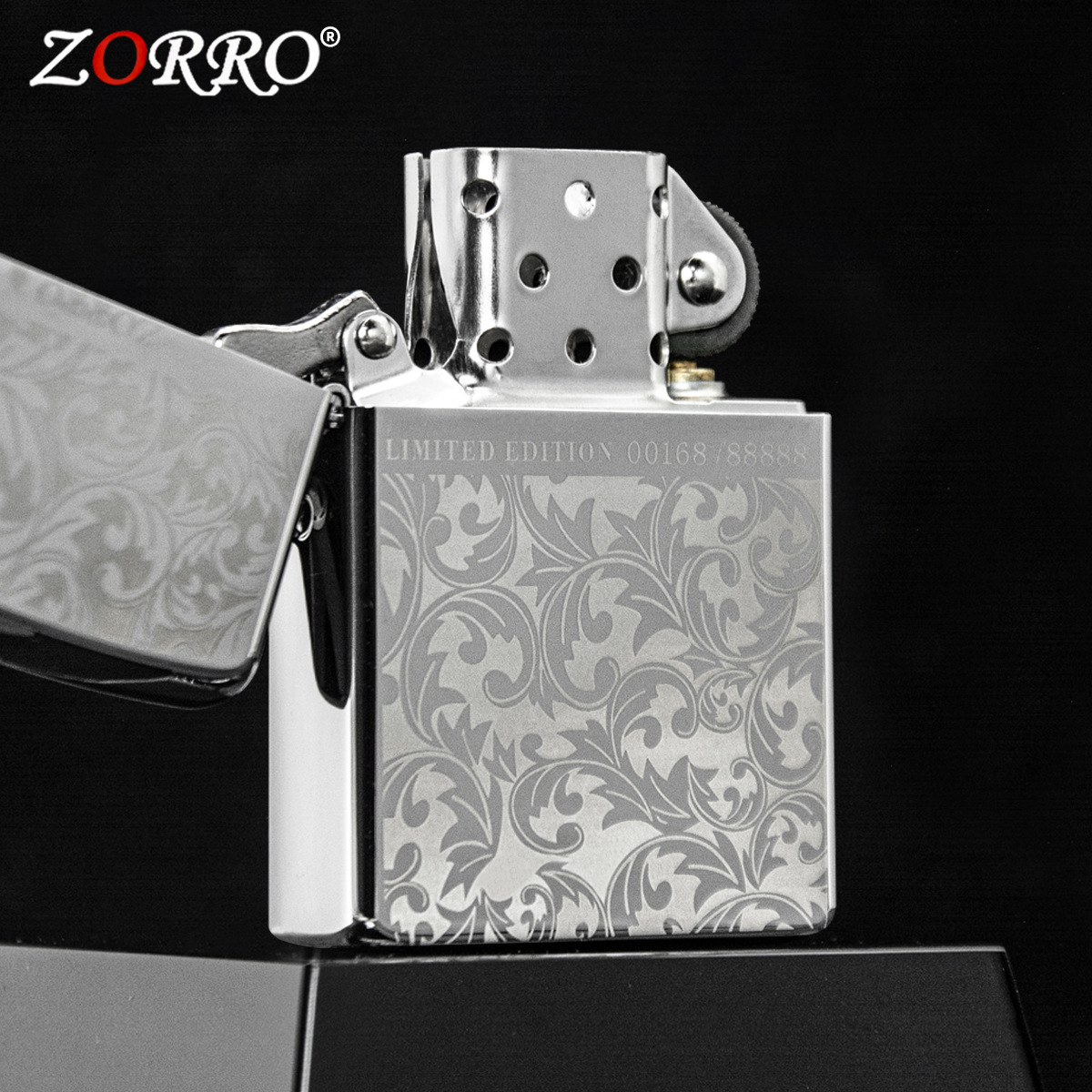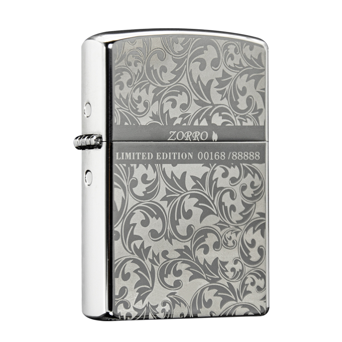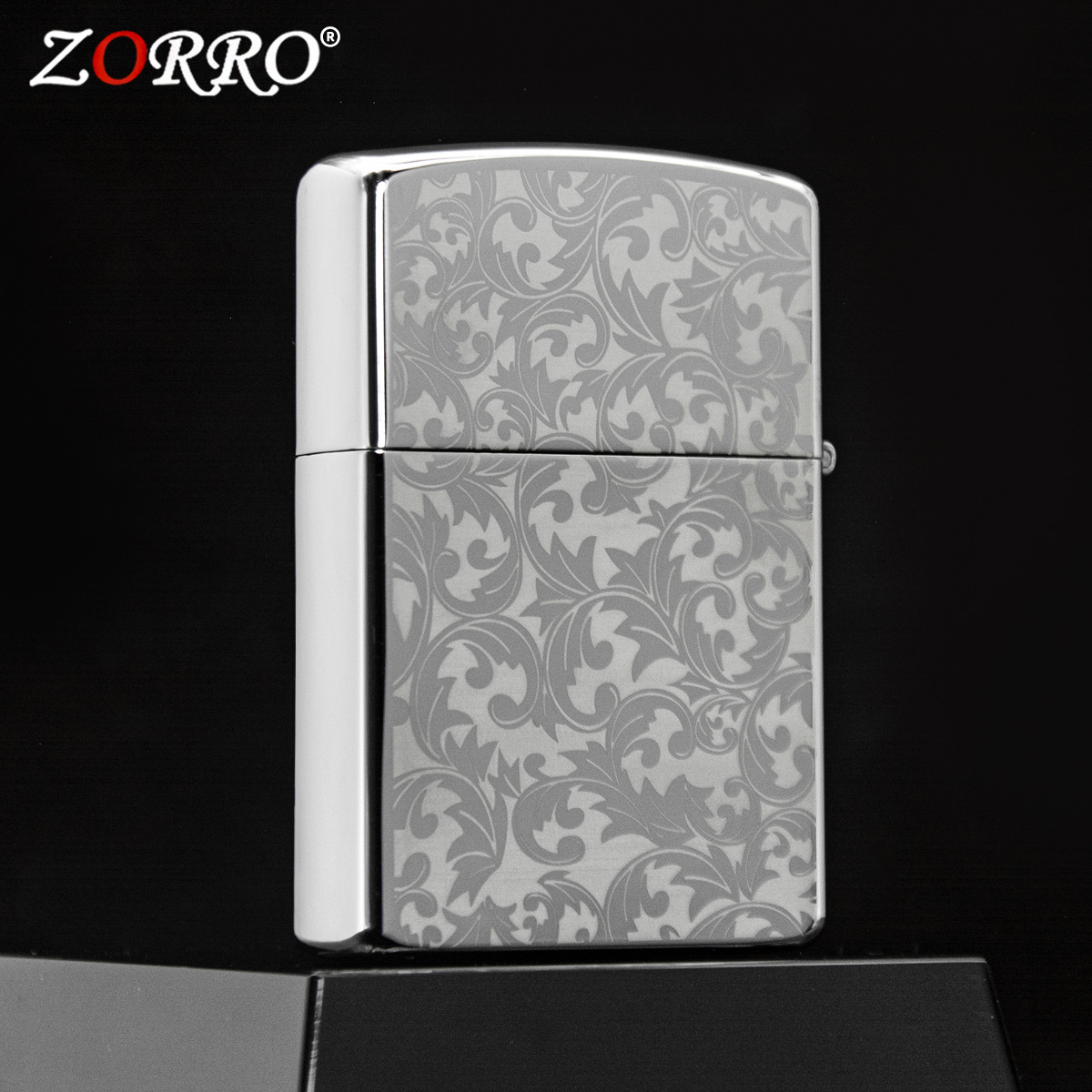 zorro佐罗正品煤油打火机砂轮防风纯铜银色镀铬雕双色幸运唐草花