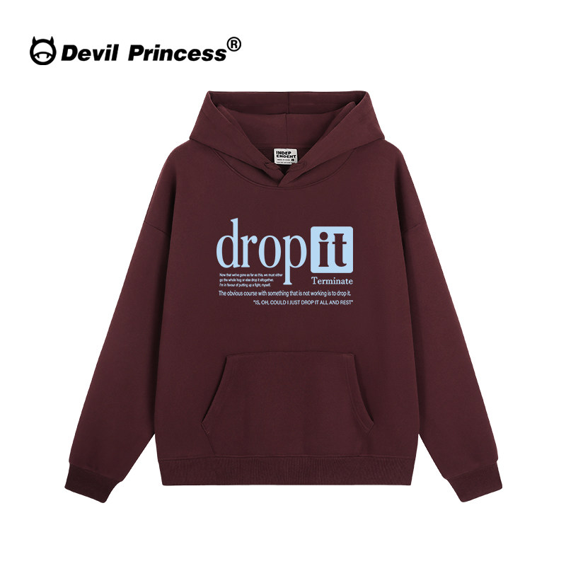 美式复古街头风酒红色连帽卫衣女加绒加厚宽松显瘦重磅套头上衣潮