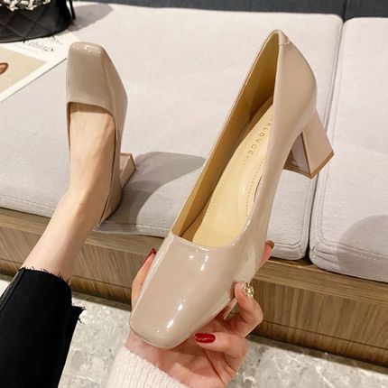 时尚裸色高跟鞋女中跟2024春夏新款气质方头浅口软皮白色粗跟单鞋