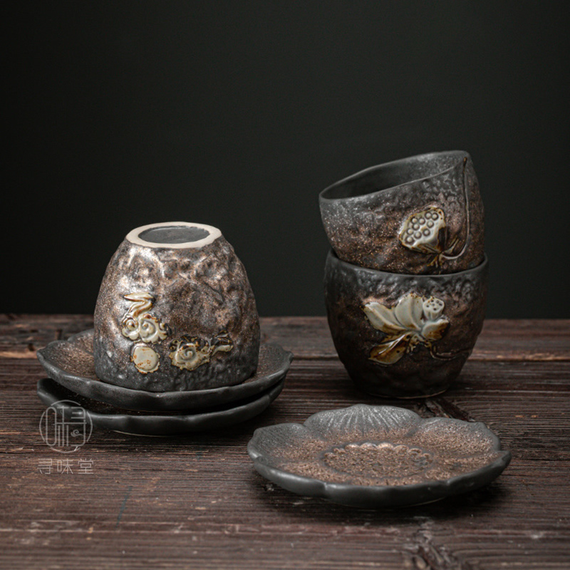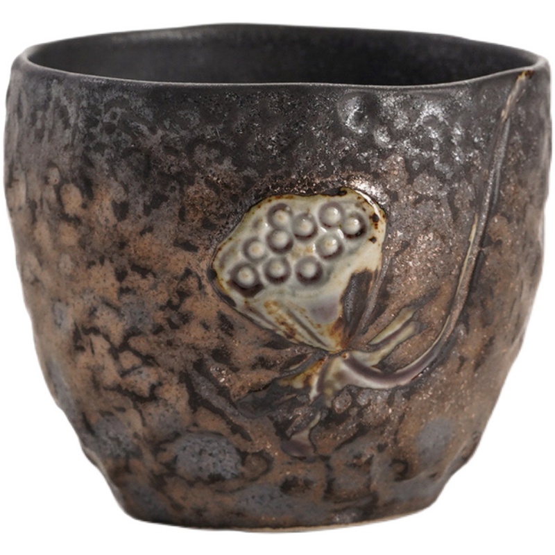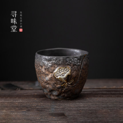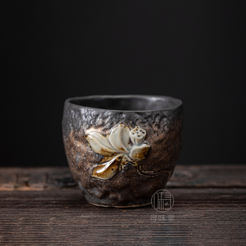 鎏金粗陶浮雕主人杯|手工品茗杯复古铁釉小茶杯功夫茶具单杯茶盏